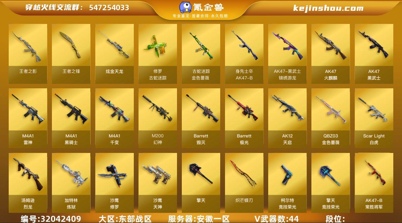 东部战区(安徽一区)ys【精品爆破号】44v【M200-幻神套+双皮/AG-CSPLS24冠军/黄忠+音效卡,古蛇迷踪套装,QBZ03-金色蔷薇+皮/Heartshot,ScarLight-白虎+皮/白鲨-CFPLS23冠军,柯尔特-竞技荣光,炽芒蝶刃,毒蜂+异变清道夫+异变镇魔者,Colt1911-大黄蜂,胡萝卜匕首】2王者【王者之影,王者之锋】2炫金【炫金天龙】3角色【四防电竞教官-云悠悠,蛇隐宗,修道士】 4音效 【M200-幻神音效卡,AK47-火麒麟音效卡,M4A1-黑骑士音效卡,Barrett-毁灭音效卡】25皮【幻神-AG-CFPLS24冠军,幻神-黄忠,金色蔷薇-Heartshot,白虎-白鲨-CFPLS23冠军,火麒麟-荣耀巅峰,雷神-源计划2.0专属,毁灭-风暴,雷神-R.LGD-CFPLS2018冠军,火麒麟-百城,裁决-巅峰荣耀,毁灭-青帝,M4A1-战神赵云,毁灭-战神张飞,毁灭-墨兰,毁灭-SV-CFPLS16冠军】小人枪【HK417-朱雀-蛇隐宗,M4A1-雷神-精英刀锋,KAC锯式机枪-黑桃战神】截图展示段位不代表实际段位 如赛季更新等不可抗拒因素发生变化、时限道具不保证所剩时间