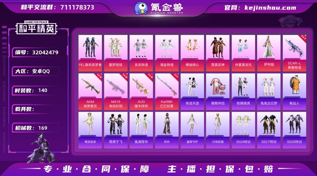 安卓 手Q-8粉装-5特效枪-0载具-58839热力值-8印记-140套装-169枪皮 【特效枪等级】:AKM-绿萝繁花(五级),SCAR-L-青春物语(七级),M416-电玩时刻(五级),AUG-暖羊咩咩(五级),Kar98K-巳巳如意(一级) 【优质套装】:粉装-PEL轰鸣竞梦者,粉装-酣梦娃娃,粉装-岚岚物语,粉装-海盐物语,粉装-橘柚倾心,粉装-霓裳武神,粉装-仲夏莫吉托,角色-萨利娅 【稀有套装】:套装-龟仙人,套装-青团波波,套装-燕燕于飞,套装-鱼渊荷华,角色-风玲,套装-晶辉守护,套装-闪电轻猫 【优质武器皮肤】:AKM-绿萝繁花,SCAR-L-青春物语,M416-电玩时刻,AUG-暖羊咩咩,Kar98K-梦幻火箭,Kar98K-巳巳如意 【稀有武器皮肤】:AKM-彩虹符号,AKM-恐龙拽拽,AKM-春暖花开,AKM-破晓战魂,AKM-缤纷海域,AKM-霓虹街区,AKM-龙的传人,M16A4-甜心亚梦,SCAR-L-炫彩节奏,SCAR-L-玉兔迎春,SCAR-L-粉色回忆,M416-滑板小狐,M416-糯团青竹,M416-红色方程式,M416-绯红前夜,M416-蓝色火焰,GROZA-治愈之星,GROZA-蓝莓炮弹,AUG-天降萌叽,AUG-耀粉歌者,QBZ-原初圣火,QBZ-飞驰魅影,M762-拳皇97,M762-深海曼妙,M762-瑞龙福将,M762-第五大道,Mk47-妙红点点,Mk47-林间仙鹿,Mk47-洛神天依,Mk47-粉色回忆,AC-VAL-天降萌叽,AC-VAL-彩虹甜喵,AC-VAL-甜心亚梦,蜜獾-垂柳戏鸭,蜜獾-娇憨猪猪,UZI-众神之王,UZI-啾咪啾咪,UZI-娇憨猪猪,UZI-炫彩节奏,UMP45-涂山之恋,UMP45-生命誓言,Vector-彩虹符号,Vector-暗夜玫瑰,Vector-治愈之星,Vector-生命誓言,汤姆逊-勇闯险境,汤姆逊-天降萌叽,汤姆逊-耀粉歌者,MP5K-众神之王,AKS-74U-鬼刀,P90-飞驰魅影,Kar98K-勇闯险境,Kar98K-彩虹符号,Kar98K-梦幻火箭,Kar98K-深海曼妙,Kar98K-飞驰魅影,M24-治愈之星,M24-炫彩节奏,M24-百合蜜语,M24-众神之王,AWM-垂柳戏鸭,SK...