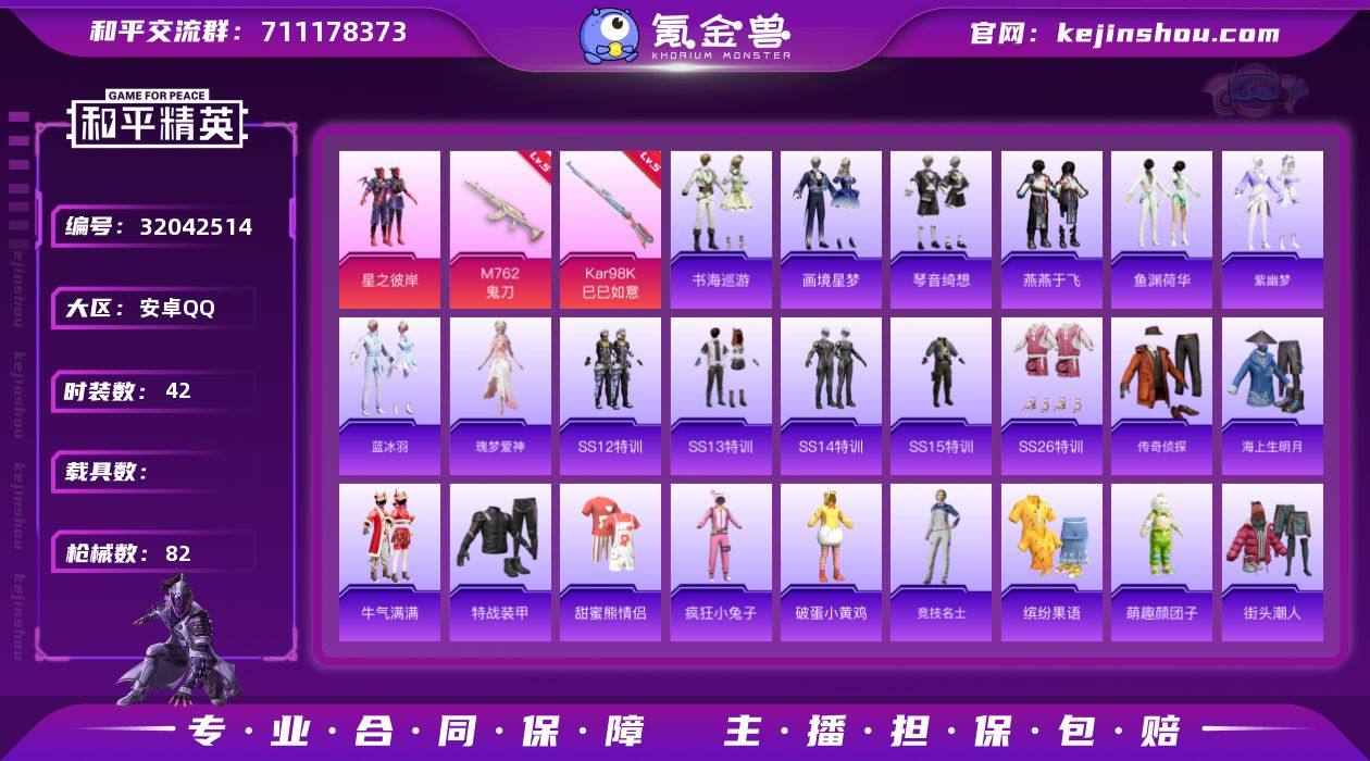 安卓 手Q-1粉装-4特效枪-0载具-0粉色飞行器-21539热力值-1王牌印记-42套装-82枪皮 【粉色套装】:粉装-星之彼岸 【粉色枪皮等级】:M762-鬼刀(五级),Kar98K-巳巳如意(五级),Mk14-福马献瑞(四级),PKM-萌骑夺宝(二级) 【粉色枪皮】:M762-鬼刀,Kar98K-巳巳如意,Mk14-福马献瑞,PKM-萌骑夺宝 【粉色降落伞】:荧海星豚降落伞,罪夜之冕降落伞 【稀有套装】:套装-马上有钱,套装-燕燕于飞,套装-鱼渊荷华,套装-紫幽梦,套装-蓝冰羽,角色-瑰梦爱神,套装-书海巡游,套装-画境星梦,套装-琴音绮想,角色-霜刃之御 【稀有枪皮】:AKM-星之彼岸,AKM-破晓战魂,AKM-萌趣颜团子,SCAR-L-炫彩节奏,SCAR-L-玉兔迎春,SCAR-L-红色方程式,M416-红色方程式,GROZA-懵萌河马,GROZA-蓝莓炮弹,AUG-耀粉歌者,M762-牛气冲天,AC-VAL-天降萌叽,ACE32-画境星梦,UMP45-夜灯,UMP45-蓝色火焰,Vector-彩虹符号,MP5K-画境星梦,AKS-74U-鬼刀,JS9-蓝晶绮麟,P90-巳巳如意,Kar98K-红色方程式,M24-炫彩节奏,VSS-星之彼岸,Mini14-炫彩节奏,Mini14-耀粉歌者,Mk14-猪猪侠,M1加兰德-画境星梦,S12K-玩趣呆呆,S12K-夜灯,AA12-G-画境星梦,M249-彩虹符号,M249-星之彼岸,M249-破晓战魂,DP-28-彩虹符号,MG3-幻世战舞者,大砍刀-鬼刀,平底锅-画境星梦,破片手榴弹-绯果甜心,破片手榴弹-巳巳如意 【其他套装】:套装-SS12特训,套装-SS13特训,套装-SS14特训,套装-SS15特训,套装-SS26特训,套装-传奇侦探,套装-海上生明月,套装-牛气满满,套装-特战装甲,套装-甜蜜熊情侣,套装-疯狂小兔子,套装-破蛋小黄鸡,套装-竞技名士,套装-缤纷果语,套装-萌趣颜团子,套装-街头潮人,套装-风暴特警,套装-快乐星愿 【营地ID】:1033425768
