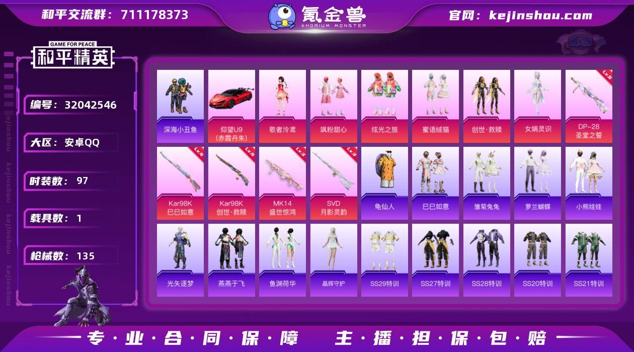 安卓 手Q-6粉装-5特效枪-1载具-42511热力值-4印记-97套装-135枪皮 【稀有载具】:仰望U9(赤霞丹朱) 【特效枪等级】:Kar98K-创世·救赎(四级),Kar98K-巳巳如意(四级),Mk14-盛世惊鸿(三级),SVD-月影灵韵(三级),DP-28-圣堂之誓(六级) 【优质套装】:角色-歌者泠鸢,粉装-飒粉甜心,粉装-炫光之旅,粉装-蜜语绒猫,套装-创世·救赎,角色-女娲灵识 【稀有套装】:套装-龟仙人,套装-巳巳如意,套装-雏菊兔兔,套装-萝兰蝴蝶,套装-小熊娃娃,角色-光矢逐梦,套装-燕燕于飞,套装-鱼渊荷华,套装-晶辉守护 【优质武器皮肤】:SCAR-L-黄金龙骨,Vector-创世·救赎,Kar98K-巳巳如意,Kar98K-创世·救赎,Mk14-盛世惊鸿,SVD-月影灵韵,DBS-创世·救赎,DP-28-圣堂之誓 【稀有武器皮肤】:AKM-江南烟雨,AKM-破晓战魂,AKM-霓虹街区,AKM-龙的传人,M16A4-幻世战舞者,SCAR-L-炫彩节奏,SCAR-L-玉兔迎春,SCAR-L-红色方程式,SCAR-L-黄金龙骨,M416-糯团青竹,M416-蓝色火焰,GROZA-彩虹符号,GROZA-影袭,GROZA-懵萌河马,AUG-天降萌叽,AUG-甜蜜菠萝,AUG-耀粉歌者,QBZ-彩虹符号,M762-天降萌叽,M762-萌物绒绒,Mk47-妙红点点,Mk47-炫光之旅,G36C-镜域双华,G36C-懵萌河马,AC-VAL-天降萌叽,AC-VAL-快闪甜心,蜜獾-天降萌叽,Famas-镜域双华,UZI-啾咪啾咪,UZI-天降萌叽,UZI-红色方程式,UMP45-夜灯,UMP45-涂山之恋,UMP45-蓝色火焰,Vector-焰鹰斗篷,Vector-生命誓言,汤姆逊-天降萌叽,汤姆逊-炫彩节奏,汤姆逊-智耀战神,P90-快闪甜心,P90-巳巳如意,M24-炫彩节奏,AWM-焰鹰斗篷,AWM-圣堂之誓,SKS-炫彩节奏,VSS-星之彼岸,Mini14-炫彩节奏,SLR-彩虹符号,SLR-墨龙九天,莫辛纳甘-懵萌河马,AMR-妙红点点,AMR-墨龙九天,M417-惊鸿侠骨,MK20-H-快闪甜心,M200-惊鸿侠骨,S686-生命誓言,S686-巳巳如...