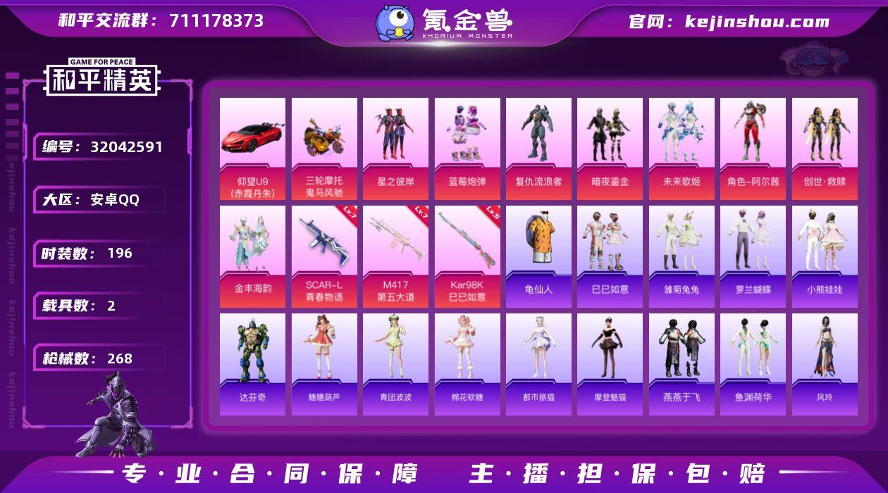 安卓 手Q-8粉装-3特效枪-2载具-85650热力值-12印记-196套装-268枪皮 【稀有载具】:仰望U9(赤霞丹朱),鬼马风驰 【特效枪等级】:SCAR-L-青春物语(七级),Kar98K-巳巳如意(五级),M417-第五大道(七级) 【优质套装】:粉装-星之彼岸,粉装-蓝莓炮弹,角色-复仇流浪者,粉装-暗夜鎏金,粉装-未来歌姬,角色-阿尔茜,套装-创世·救赎,粉装-金丰海韵 【稀有套装】:套装-龟仙人,套装-巳巳如意,套装-雏菊兔兔,套装-萝兰蝴蝶,套装-小熊娃娃,角色-达芬奇,套装-糖糖葫芦,套装-青团波波,套装-棉花软糖,角色-都市丽猫,角色-摩登魅猫,套装-燕燕于飞,套装-鱼渊荷华,角色-风玲,套装-紫幽梦,套装-蓝冰羽,套装-星影赞美诗,套装-星渊小夜曲 【优质武器皮肤】:SCAR-L-青春物语,Kar98K-巳巳如意,M417-第五大道 【稀有武器皮肤】:AKM-墨染幽兰,AKM-夜灯,AKM-彩虹符号,AKM-恐龙拽拽,AKM-灼热熔岩,AKM-环太平洋,AKM-破晓战魂,AKM-胡桃卫兵,AKM-萌趣颜团子,AKM-虎虎生威,AKM-霓虹街区,AKM-龙的传人,M16A4-夜灯,M16A4-幻世战舞者,M16A4-甜心亚梦,M16A4-红色方程式,M16A4-千金淑猫,SCAR-L-炫彩节奏,SCAR-L-玉兔迎春,SCAR-L-碧影闪光,SCAR-L-龙宫之主,M416-暗夜行者,M416-糯团青竹,M416-红色方程式,M416-蓝色火焰,GROZA-异彩先驱,GROZA-彩虹符号,GROZA-影袭,GROZA-恐龙拽拽,GROZA-春暖花开,GROZA-治愈之星,GROZA-田园牧歌,AUG-流星咚咚,AUG-灵符少年,AUG-耀粉歌者,AUG-青春冒险家,QBZ-原初圣火,QBZ-彩虹符号,QBZ-飞驰魅影,M762-天降萌叽,M762-牛气冲天,M762-瑞龙福将,Mk47-妙红点点,Mk47-洛神天依,Mk47-青春冒险家,G36C-暗夜玫瑰,G36C-星穹咏叹调,AC-VAL-天降萌叽,AC-VAL-彩虹甜喵,AC-VAL-快闪甜心,AC-VAL-甜心亚梦,AC-VAL-闲梦青缨,蜜獾-千面幻镜,蜜獾-天降...