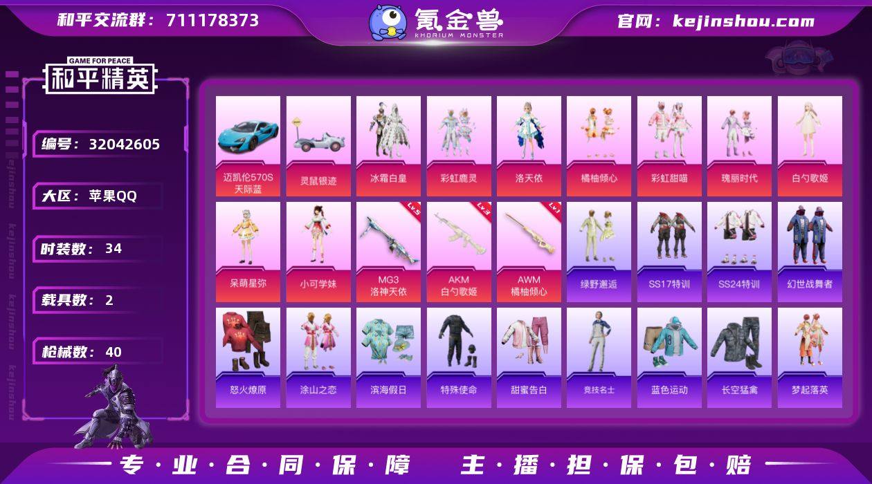苹果 手Q-10粉装-3特效枪-2载具-18114热力值-2印记-34套装-40枪皮 【稀有载具】:迈凯伦570S(天际蓝),灵鼠银迹 【特效枪等级】:AKM-白勺歌姬(三级),AWM-橘柚倾心(一级),MG3-洛神天依(五级) 【优质套装】:粉装-冰霜白皇,粉装-彩虹鹿灵,角色-洛天依,粉装-橘柚倾心,粉装-彩虹甜喵,粉装-瑰丽时代,粉装-绿野邂逅,角色-白勺歌姬,角色-呆萌星弥,角色-小可学妹 【优质武器皮肤】:AKM-白勺歌姬,AWM-橘柚倾心,MG3-洛神天依 【稀有武器皮肤】:AKM-虎虎生威,SCAR-L-红色方程式,M416-红色方程式,M416-罗小黑,GROZA-懵萌河马,AUG-耀粉歌者,QBZ-洛神天依,M762-橘柚倾心,M762-瑞龙福将,Mk47-洛神天依,G36C-懵萌河马,G36C-暗夜玫瑰,UZI-幽秘魅影,UMP45-涂山之恋,汤姆逊-耀粉歌者,Kar98K-洛神天依,Kar98K-炫彩节奏,SKS-炫彩节奏,Win94-瑞龙福将,莫辛纳甘-懵萌河马,AMR-暗夜行者,AMR-白勺歌姬,M200-梦幻舞会,S686-橘柚倾心,S686-白勺歌姬,S12K-瑞龙福将,DBS-彩虹甜喵,DP-28-橘柚倾心,MG3-瑞龙福将,PKM-懵萌河马,蝎式手枪-幽秘魅影 【其他套装】:套装-SS17特训,套装-SS24特训,套装-幻世战舞者,套装-怒火燎原,套装-涂山之恋,套装-滨海假日,套装-特殊使命,套装-甜蜜告白,套装-竞技名士,套装-蓝色运动,套装-长空猛禽,套装-梦起落英,套装-瑞龙福将,套装-团圆交子,套装-电音精灵,套装-天籁歌者,套装-茉莉之诺,套装-豚鼠丹丹,套装-沁蓝冰爽,套装-浓情蜜辣,套装-俏皮奶喵,套装-暖心橘喵,套装-懵萌河马,套装-神气柴柴 【优质飞行器】:梦幻舞会飞行器 【优质降落伞】:神秘黑猫降落伞,绮梦青鸾降落伞,洛神天依降落伞,橘柚倾心降落伞,彩虹甜喵降落伞,白勺歌姬降落伞 【稀有头盔】:深海小丑鱼头盔(2级) 【稀有背包】:深海小丑鱼背包(3级),神秘黑猫背包(...
