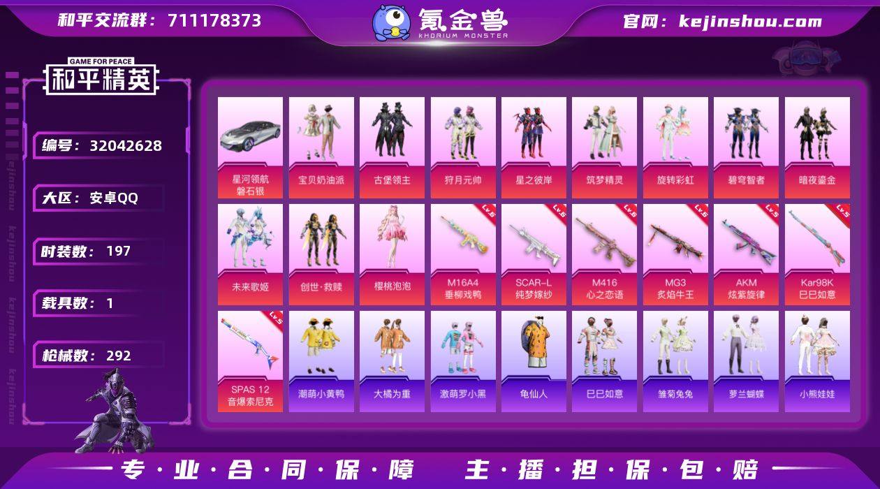 安卓 手Q-11粉装-7特效枪-1载具-98027热力值-4印记-197套装-292枪皮 【稀有载具】:星河领航(磐石银) 【特效枪等级】:AKM-炫紫旋律(五级),M16A4-垂柳戏鸭(六级),SCAR-L-纯梦嫁纱(六级),M416-心之恋语(六级),Kar98K-巳巳如意(五级),SPAS-12-音爆索尼克(五级),MG3-炙焰牛王(六级) 【优质套装】:粉装-宝贝奶油派,粉装-古堡领主,粉装-狩月元帅,粉装-星之彼岸,粉装-筑梦精灵,粉装-旋转彩虹,粉装-碧穹智者,粉装-暗夜鎏金,粉装-未来歌姬,套装-创世·救赎,角色-樱桃泡泡 【稀有套装】:套装-龟仙人,套装-巳巳如意,套装-雏菊兔兔,套装-萝兰蝴蝶,套装-小熊娃娃,套装-糖糖葫芦,套装-青团波波,角色-都市丽猫,套装-紫幽梦,套装-蓝冰羽,角色-瑰梦爱神 【优质武器皮肤】:AKM-炫紫旋律,M16A4-垂柳戏鸭,SCAR-L-黄金龙骨,SCAR-L-纯梦嫁纱,M416-心之恋语,Kar98K-梦幻火箭,Kar98K-巳巳如意,SPAS-12-音爆索尼克,MG3-炙焰牛王 【稀有武器皮肤】:AKM-2P战斗服款,AKM-PEL轰鸣竞梦者,AKM-夜灯,AKM-天启纪元,AKM-星兔领航员,AKM-灼热熔岩,AKM-玉龙,AKM-生命誓言,AKM-破晓战魂,AKM-霓虹街区,AKM-龙的传人,M16A4-夜灯,M16A4-幻世战舞者,M16A4-快乐主宰,M16A4-机械英豪,M16A4-甜心亚梦,M16A4-生命誓言,M16A4-蓝色火焰,M16A4-魔法学院,SCAR-L-炫彩节奏,SCAR-L-玉兔迎春,SCAR-L-生命誓言,SCAR-L-红色方程式,SCAR-L-黄金龙骨,M416-夜灯,M416-神秘黑猫,M416-糯团青竹,M416-红色方程式,GROZA-懵萌河马,GROZA-春暖花开,GROZA-治愈之星,GROZA-生命誓言,GROZA-田园牧歌,GROZA-黑色刀锋,AUG-天降萌叽,AUG-耀粉歌者,AUG-黑白懵懵牛,QBZ-原初圣火,QBZ-未来歌姬,QBZ-洛神天依,QBZ-神秘黑猫,M762-天降萌叽,M762-彩虹符号,M762-快乐主宰,M762-拳皇97,M762-潮萌小黄鸭,M...