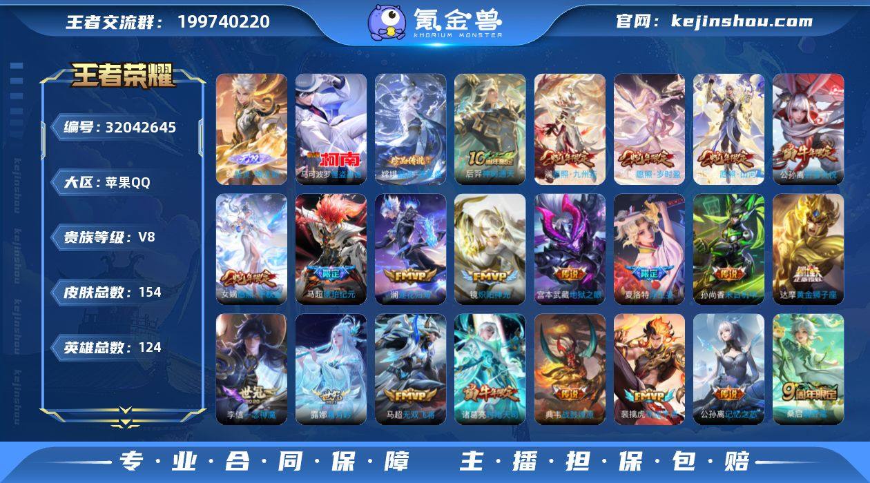 包里一颗水晶 苹果Q-V8-至尊星耀II段位-124英雄-154皮肤-1无双-2珍品传说-24传说-42史诗 【英雄全皮】:敖隐全皮 【无双皮肤】:曜器灵螭龙剑 【珍品传说】:嫦娥器灵落星盏,马可波罗怪盗基德 【传说皮肤】:后羿神树通天,司空震愿照山河定,女娲愿照千秋盛,澜愿照九州拓,虞姬愿照岁时盈,裴擒虎祥瑞亨通,桑启鸣野蒿,典韦战鼓燎原,马超琥珀纪元,澜逐花归海,露娜霜月吟,上官婉儿妄想奇谈,公孙离记忆之芯,夏洛特浮生妄,马超无双飞将,公孙离祈雪灵祝,诸葛亮时雨天司,镜炽阳神光,虞姬启明星使,李信一念神魔,刘备时之恋人,达摩黄金狮子座,孙尚香末日机甲,宫本武藏地狱之眼 【限定皮肤】:虞姬夏日便利店,姜子牙天穹之誓,狄仁杰阴阳师,赵云皇家上将,马可波罗暗影游猎,狄仁杰魔术师,项羽海滩派对,老夫子醍醐杖,韩信傲雪梅枪,虞姬启明星使,干将莫邪冰霜恋舞曲,干将莫邪胡桃夹子,诸葛亮时雨天司,公孙离祈雪灵祝,裴擒虎李小龙,米莱狄胡桃异想国,上官婉儿妄想奇谈,蒙犽狂想玩偶喵,鲁班大师探海日志,夏洛特浮生妄,艾琳流音漫舞,马超琥珀纪元,沈梦溪龙舞盛年,鲁班七号蔬乡物语 【年限皮肤】:公孙离祈雪灵祝,诸葛亮时雨天司,司空震愿照山河定,女娲愿照千秋盛,澜愿照九州拓,虞姬愿照岁时盈 【赛季限定】:老夫子醍醐杖,鲁班大师探海日志,姜子牙天穹之誓,东皇太一噬灭天穹,太乙真人谧流熔炉,钟馗虚灵犬护,亚瑟荣光之誓 【战令限定】:马可波罗暗影游猎,蒙犽狂想玩偶喵,米莱狄胡桃异想国,艾琳流音漫舞,鲁班七号蔬乡物语,虞姬夏日便利店,亚连破空之剑,孙悟空神迹守卫,百里守约百相守梦,老夫子百相守梦,孙膑茶境仙,马超访茗客,刘禅鸭鸭历险记,沈梦溪鸭鸭历险记,莱西奥光弋星穹,明世隐往忆晖光,周瑜线条小狗 【史诗皮肤】:上官婉儿春霖将至,周瑜线条小狗...