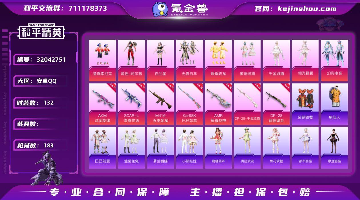 安卓 手Q-10粉装-7特效枪-0载具-61608热力值-12印记-132套装-183枪皮 【特效枪等级】:AKM-炫紫旋律(七级),SCAR-L-青春物语(七级),M416-五爪金龙(七级),Kar98K-巳巳如意(五级),AMR-智耀战神(五级),DP-28-暗夜鎏金(一级),DP-28-千金淑猫(四级) 【优质套装】:粉装-音爆索尼克,角色-阿尔茜,角色-白兰星,粉装-无畏白羊,粉装-暖暖奶龙,粉装-蜜语绒猫,角色-千金淑猫,角色-翎光蝶翼,粉装-幻彩电音 【稀有套装】:套装-龟仙人,套装-巳巳如意,套装-雏菊兔兔,套装-萝兰蝴蝶,套装-小熊娃娃,套装-糖糖葫芦,套装-青团波波,套装-棉花软糖,角色-都市丽猫,角色-摩登魅猫,角色-临安公主,套装-燕燕于飞,套装-鱼渊荷华,套装-晶灵使者,套装-晶辉守护,角色-蜜桃派对,套装-紫幽梦,套装-蓝冰羽,角色-鲛海歌灵,套装-极速光影 【优质武器皮肤】:AKM-炫紫旋律,SCAR-L-青春物语,M416-五爪金龙,Kar98K-巳巳如意,AMR-智耀战神,DP-28-暗夜鎏金,DP-28-千金淑猫 【稀有武器皮肤】:AKM-彩虹符号,AKM-破晓战魂,AKM-龙的传人,M16A4-幻世战舞者,M16A4-甜心亚梦,M16A4-千金淑猫,SCAR-L-暗夜玫瑰,SCAR-L-玉兔迎春,M416-糯团青竹,M416-红色方程式,GROZA-懵萌河马,GROZA-田园牧歌,GROZA-晶梦幻蝶,AUG-2P战斗服款,AUG-耀粉歌者,QBZ-飞驰魅影,M762-天降萌叽,M762-甜心宝贝,Mk47-妙红点点,Mk47-炫光之旅,Mk47-百万伏特,G36C-懵萌河马,G36C-星穹咏叹调,AC-VAL-天降萌叽,AC-VAL-彩虹甜喵,AC-VAL-快闪甜心,AC-VAL-甜心亚梦,蜜獾-天降萌叽,蜜獾-娇憨猪猪,Famas-墨龙九天,UZI-娇憨猪猪,UZI-炫彩节奏,UZI-金风玉露,UZI-月影灵韵,UMP45-夜灯,UMP45-炫光之旅,UMP45-猪猪侠,Vector-焰鹰斗篷,Vector-生命誓言,Vector-田园牧歌,Vector-音爆索尼克,Vector-创世·救赎,汤姆逊-天降萌叽...