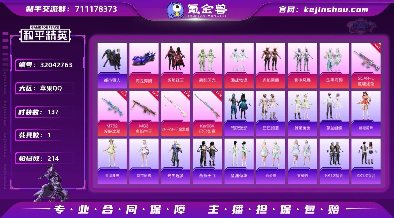 苹果 手Q-6粉装-5特效枪-1载具-66995热力值-10印记-137套装-214枪皮 【稀有载具】:海龙奔腾 【特效枪等级】:SCAR-L-童趣迷兔(七级),M762-冷魅冰骑(七级),Kar98K-巳巳如意(五级),DP-28-千金淑猫(六级),MG3-炙焰牛王(七级) 【优质套装】:粉装-炙焰红王,粉装-碧影闪光,粉装-海盐物语,粉装-赤焰黑爵,粉装-紫电风暴,粉装-金丰海韵 【稀有套装】:套装-巳巳如意,套装-雏菊兔兔,套装-萝兰蝴蝶,套装-糖糖葫芦,套装-青团波波,角色-都市丽猫,角色-光矢逐梦,套装-燕燕于飞,套装-鱼渊荷华,套装-云朵鹅,套装-雪绒豹 【优质武器皮肤】:SCAR-L-童趣迷兔,M762-冷魅冰骑,Kar98K-巳巳如意,DP-28-千金淑猫,MG3-炙焰牛王 【稀有武器皮肤】:AKM-夜灯,AKM-彩虹符号,AKM-影袭,AKM-春暖花开,AKM-灼热熔岩,AKM-破晓战魂,AKM-筑梦精灵,AKM-萌趣颜团子,AKM-虎虎生威,AKM-霓虹街区,M16A4-幻世战舞者,M16A4-甜心亚梦,M16A4-蓝色火焰,SCAR-L-炫彩节奏,SCAR-L-玉兔迎春,M416-月影鸳鸯,M416-糯团青竹,M416-红色方程式,M416-蓝色火焰,GROZA-异彩先驱,GROZA-彩虹符号,GROZA-影袭,GROZA-恐龙拽拽,GROZA-治愈之星,GROZA-田园牧歌,GROZA-蓝莓炮弹,AUG-天降萌叽,AUG-耀粉歌者,AUG-闲梦青缨,AUG-青春冒险家,QBZ-原初圣火,QBZ-彩虹符号,QBZ-洛神天依,QBZ-飞驰魅影,M762-天降萌叽,M762-牛气冲天,M762-瑞龙福将,M762-诡娃娃,M762-镭射皇者,M762-云朵鹅,Mk47-青春冒险家,G36C-冷魅冰骑,G36C-时空追击者,G36C-暗夜玫瑰,AC-VAL-天降萌叽,AC-VAL-甜心亚梦,蜜獾-天降萌叽,蜜獾-娇憨猪猪,UZI-天降萌叽,UZI-娇憨猪猪,UZI-影袭,UZI-炫彩节奏,UZI-红色方程式,UMP45-时空追击者,UMP45-生命誓言,UMP45-蓝色火焰,Vector-焰鹰斗篷,Vector-彩虹符号,Vector-治愈之星,Vector-田园牧...