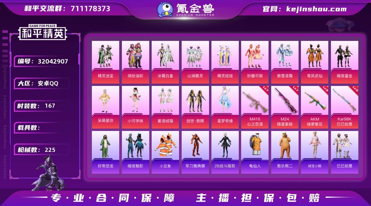 安卓 手Q-14粉装-4特效枪-0载具-67870热力值-7印记-167套装-225枪皮 【特效枪等级】:AKM-绿萝繁花(五级),M416-心之恋语(七级),Kar98K-巳巳如意(五级),M24-暗星紫秘(七级) 【优质套装】:粉装-精灵迷巫,粉装-缤纷油彩,粉装-冰霜白皇,粉装-山涧鹿灵,粉装-精灵娃娃,粉装-妙趣可丽,粉装-傲雪凌霜,粉装-鸾凤武仙,粉装-暗夜鎏金,角色-呆萌星弥,角色-小可学妹,粉装-蜜语绒猫,套装-创世·救赎,角色-星梦奇缘 【稀有套装】:套装-龟仙人,玩偶服-憨乐熊二,套装-绒宝小鹅,套装-巳巳如意,套装-雏菊兔兔,套装-萝兰蝴蝶,角色-达芬奇,角色-狂花道·雅典娜,套装-糖糖葫芦,套装-青团波波,角色-摩登魅猫,角色-俏兔智灵,套装-燕燕于飞,套装-鱼渊荷华,玩偶服-小狗蛇点点,套装-晶辉守护,套装-雪夜云雾,套装-晨曦轻云,角色-幽澜祭司,角色-鲛海歌灵,套装-星渊小夜曲,套装-诡诞巡游 【优质武器皮肤】:AKM-绿萝繁花,M416-心之恋语,Kar98K-巳巳如意,M24-暗星紫秘 【稀有武器皮肤】:AKM-彩虹符号,AKM-破晓战魂,AKM-霓虹街区,AKM-龙的传人,M16A4-幻世战舞者,M16A4-生命誓言,M16A4-莲影清波,SCAR-L-幽秘魅影,SCAR-L-玉兔迎春,SCAR-L-红色方程式,SCAR-L-小狗蛇点点,M416-糯团青竹,M416-红色方程式,M416-绯红前夜,M416-蓝色火焰,M416-魔法学院,GROZA-影袭,GROZA-恐龙拽拽,GROZA-懵萌河马,GROZA-春暖花开,GROZA-田园牧歌,GROZA-晶梦幻蝶,AUG-冰川粉黛,AUG-圣光天使,AUG-天降萌叽,AUG-耀粉歌者,QBZ-彩虹符号,QBZ-未来歌姬,M762-天降萌叽,M762-彩虹甜喵,M762-暗夜鎏金,M762-甜心宝贝,Mk47-妙红点点,Mk47-林间仙鹿,G36C-懵萌河马,AC-VAL-天降萌叽,AC-VAL-彩虹甜喵,AC-VAL-快闪甜心,蜜獾-天降萌叽,蜜獾-娇憨猪猪,UZI-啾咪啾咪,UZI-天降萌叽,UZI-娇憨猪猪,UZI-生...