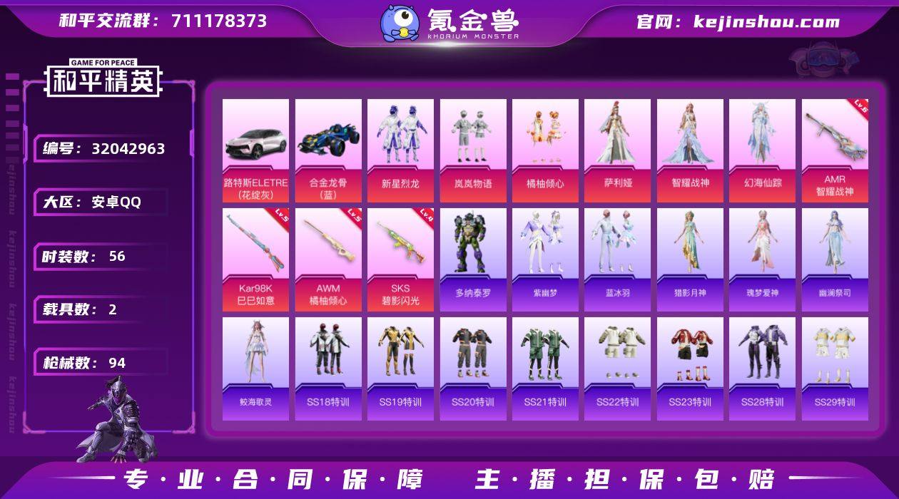 安卓 手Q-6粉装-4特效枪-2载具-30838热力值-4印记-56套装-94枪皮 【稀有载具】:路特斯ELETRE(花绽灰),合金龙骨(蓝) 【特效枪等级】:Kar98K-巳巳如意(五级),AWM-橘柚倾心(五级),SKS-碧影闪光(四级),AMR-智耀战神(六级) 【优质套装】:粉装-新星烈龙,粉装-岚岚物语,粉装-橘柚倾心,角色-萨利娅,角色-智耀战神,角色-幻海仙踪 【稀有套装】:角色-多纳泰罗,套装-紫幽梦,套装-蓝冰羽,角色-猎影月神,角色-瑰梦爱神,角色-幽澜祭司,角色-鲛海歌灵 【优质武器皮肤】:Kar98K-巳巳如意,AWM-橘柚倾心,SKS-碧影闪光,AMR-智耀战神 【稀有武器皮肤】:AKM-灼热熔岩,AKM-霓虹街区,SCAR-L-炫彩节奏,SCAR-L-玉兔迎春,SCAR-L-红色方程式,M416-糯团青竹,M416-红色方程式,GROZA-异彩先驱,GROZA-恐龙拽拽,GROZA-田园牧歌,GROZA-紫翼圣骑,AUG-耀粉歌者,QBZ-彩虹符号,QBZ-飞驰魅影,M762-天降萌叽,M762-彩虹符号,M762-橘柚倾心,G36C-炙焰牛王,G36C-星穹咏叹调,AC-VAL-天降萌叽,AC-VAL-彩虹甜喵,蜜獾-垂柳戏鸭,蜜獾-天降萌叽,蜜獾-娇憨猪猪,UZI-娇憨猪猪,Vector-田园牧歌,汤姆逊-庄周梦蝶,汤姆逊-异彩先驱,汤姆逊-智耀战神,MP5K-异彩先驱,P90-飞驰魅影,燃点复合弓-幻海仙踪,P90-巳巳如意,Kar98K-炫彩节奏,Kar98K-王子的夏天,Kar98K-飞驰魅影,VSS-田园牧歌,VSS-碧影闪光,Mini14-异彩先驱,Mk47-幻海仙踪,Win94-星兔领航员,SLR-娇憨猪猪,SLR-彩虹符号,S686-橘柚倾心,S686-千金淑猫,S1897-炫彩节奏,S1897-飞驰魅影,S12K-娇憨猪猪,S12K-幻世战舞者,S12K-智耀战神,DBS-暗星紫秘,SPAS-12-田园牧歌,M249-糯团青竹,DP-28-彩虹符号,DP-28-橘柚倾心,MG3-智耀战神,沙漠之鹰-旋转彩虹,大砍刀-鬼刀 【其他套装】:套装-SS18特训,套装-SS19特训,套装-SS20特训,套装-SS...