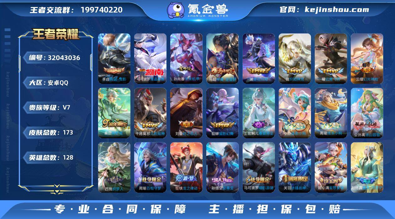 CHC30220,1星元/10按键,有钱包,安卓Q-V7-至尊星耀II段位-128英雄-173皮肤-1典藏皮肤-1珍品传说-9传说-52史诗 【英雄全皮】:敖隐全皮,空空儿全皮,影全皮 【荣耀典藏】:李白鸣剑曳影 【珍品传说】:马可波罗怪盗基德 【传说皮肤】:马超神骥逐星野,云缨幻光神枪,桑启鸣野蒿,澜逐花归海,镜炽阳神光,曜云鹰飞将,刘备时之恋人,貂蝉猫影幻舞,干将莫邪久胜战神 【限定皮肤】:蔡文姬夏日便利店,虞姬夏日便利店,姜子牙天穹之誓,狄仁杰阴阳师,赵云皇家上将,芈月重明,夏侯惇朔风刀,典韦穷奇,马可波罗暗影游猎,狄仁杰魔术师,狄仁杰万华元夜,项羽海滩派对,老夫子醍醐杖,关羽冰锋战神,程咬金演武夺筹,孙悟空至尊宝,虞姬霸王别姬,钟馗驱傩正仪,鬼谷子原初探秘者,弈星混沌棋,明世隐疑决卦,裴擒虎李小龙,裴擒虎擒涛扼浪,狂铁御狮,米莱狄御霄,云中君纤云弄巧,盾山御銮,猪八戒西部大镖客,嫦娥拒霜思,鬼谷子天穹祈灯,伽罗琥珀纪元,姬小满妄想食味,沈梦溪龙舞盛年,刘邦剑破天穹 【赛季限定】:芈月重明,典韦穷奇,狂铁御狮,米莱狄御霄,盾山御銮,夏侯惇朔风刀,弈星混沌棋,明世隐疑决卦,老夫子醍醐杖,鬼谷子原初探秘者,狄仁杰万华元夜,程咬金演武夺筹,钟馗驱傩正仪,裴擒虎擒涛扼浪,鬼谷子天穹祈灯,刘邦剑破天穹,姜子牙天穹之誓,东皇太一噬灭天穹,太乙真人谧流熔炉,钟馗虚灵犬护,甄姬逆浪荇歌,亚瑟荣光之誓 【战令限定】:马可波罗暗影游猎,猪八戒西部大镖客,蔡文姬夏日便利店,虞姬夏日便利店,亚连破空之剑,孙悟空神迹守卫,百里守约百相守梦,老夫子百相守梦,周瑜百相守梦,孙策百相守梦,周瑜线条小狗,小乔线条小狗 【史诗皮肤】:上官婉儿春霖将至,周瑜线条小狗,小乔线条小狗,公孙离涂山容容,西施织梦人,周瑜百相守梦,狂铁龙之律动,赵怀真器灵浮梦...