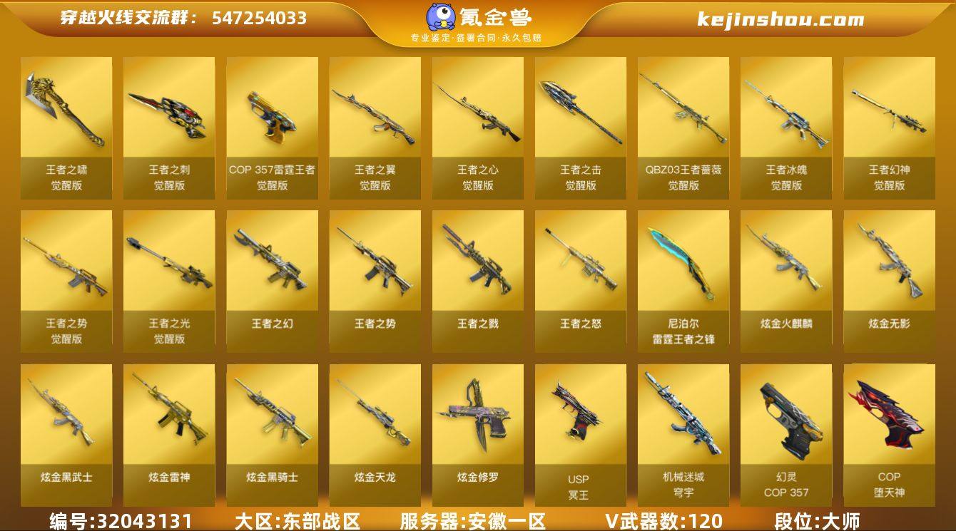 安徽一区-143V-22王者武器数-8炫金武器数 【热门武器】:Scar Light-白虎,HK417-朱雀,M200-幻神,死亡之眼,M4A1-黑骑士*2,汤姆逊-烈龙*6,RPK-盘龙*3,加特林-炼狱*2,斯泰尔-蝴蝶,降世魔童,雷神-小红,火麒麟-绝迹,COP-白鲨,COP-堕天神*2,COP 357-幻灵*2,沙鹰-修罗*4,金刚伞 【王者炫金武器】:王者之戮,王者之幻,王者之势,王者之怒,雷霆王者之锋,炫金火麒麟,炫金骑士,炫金无影,炫金雷神,炫金武士,炫金天龙,炫金修罗*2 【音效卡】:AK47-火麒麟音效卡,M4A1-雷神音效卡,M4A1-黑骑士音效卡,Barrett-毁灭音效卡 【皮肤】:裁决-运输船 皮肤,雷神-暗月,雷神-星空,雷神-虎将,AK47-火麒麟-传奇EVEN,火麒麟-盘古,毁灭耀金皮肤,毁灭-星空,毁灭-英雄计划 皮肤,黑龙-暗月,无影耀金皮肤,战神-紫绶金章皮肤*4,战神-流金岁月皮肤*2,天龙-能量核心,AWM-天龙-传奇70KG,极光-能量核心,修罗-能量核心*2,屠龙-惊鸿 皮肤 【角色】:葵,樱,魅影,迷迭香,影豹,电竞教官-云悠悠,王者-瞳-闭月羞花,王者玲珑,修道士,空,暗夜-X,风暴女,娟娟,兰-海滩派对,兰-新年限定,兰妹妹,零-水下丽影,灵狐者-X,灵狐者-职业经理,龙儿,龙儿-小淘气,青霞仙子,铁骑荣耀 【人偶武器】:雷神-小红,火麒麟-绝迹,COP-白鲨,火麒麟-灵狐,斯泰尔-蝴蝶,巴雷特-零-水下丽影*3,COP-旗袍,夺魂,迷你生化手雷,生化手雷-机甲核心*2,闪光弹-小乔,降世魔童 【暴走生化】:死亡之眼,超级对讲机 【挑战大师】:神圣爆裂者III,VEPR-12-金魔,激光毁灭者III,机甲撕裂者III 【英雄级武器】:AK47-火麒麟,M4A1-黑龙,M4A1-雷神,M4A1-黑骑士*2,AK47-黑武士,AK12-天启,AN94-超新星*2,AK47-黑鲨*2,M4A1-堕天神,HK417-朱雀,Scar Light-白虎,M4A1-幻灵,M4A1-玫瑰精灵,M4A1-猎神,9A91-烈火*3...