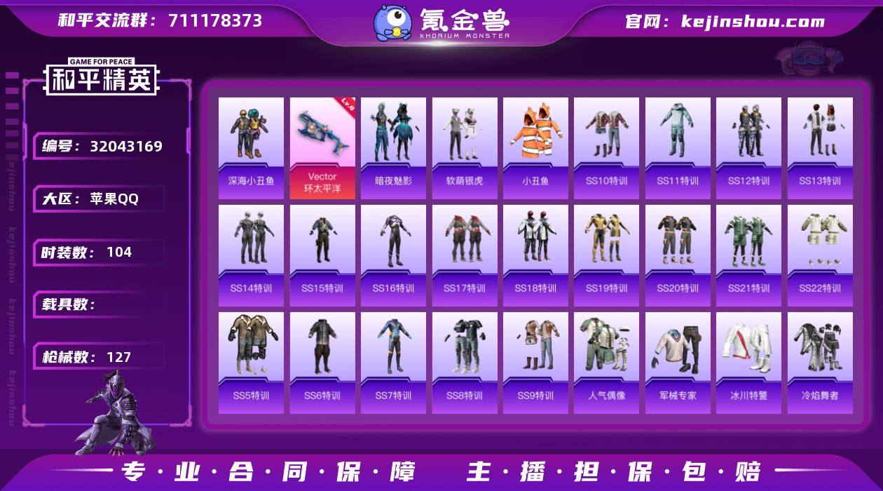 【1特效枪 软萌银虎 深海小丑鱼 巡查衣】:苹果 手Q-0粉装-1特效枪-0载具-37322热力值--1印记-104套装-127枪皮 【特效枪等级】:Vector-环太平洋(四级Vector-环太平洋) 【优质武器皮肤】:SCAR-L-黄金龙骨,Vector-环太平洋 【稀有武器皮肤】:AKM-夜灯,AKM-彩虹符号,AKM-灼热熔岩,AKM-玉龙,AKM-生命誓言,AKM-缤纷海域,AKM-萌趣颜团子,AKM-虎虎生威,AKM-霓虹街区,M16A4-幻世战舞者,M16A4-甜心亚梦,M16A4-红色方程式,SCAR-L-炫彩节奏,SCAR-L-玉兔迎春,SCAR-L-红色方程式,SCAR-L-黄金龙骨,M416-动感兔斯基,M416-夜灯,M416-神秘黑猫,M416-紫翼圣骑,M416-红色方程式,M416-绯红前夜,M416-蓝色火焰,GROZA-异彩先驱,GROZA-彩虹符号,GROZA-生命誓言,GROZA-田园牧歌,GROZA-紫翼圣骑,AUG-流星咚咚,AUG-青春冒险家,QBZ-彩虹符号,QBZ-神秘黑猫,QBZ-飞驰魅影,M762-牛气冲天,M762-瑞龙福将,M762-绯红前夜,Mk47-青春冒险家,G36C-不夜海上花,AC-VAL-天降萌叽,AC-VAL-甜心亚梦,蜜獾-娇憨猪猪,UZI-娇憨猪猪,UZI-炫彩节奏,UZI-红色方程式,UMP45-夜灯,UMP45-生命誓言,Vector-田园牧歌,汤姆逊-异彩先驱,汤姆逊-环太平洋,汤姆逊-耀粉歌者,野牛-青春冒险家,MP5K-异彩先驱,P90-飞驰魅影,Kar98K-彩虹符号,Kar98K-影袭,Kar98K-王子的夏天,Kar98K-红色方程式,Kar98K-飞驰魅影,M24-炫彩节奏,M24-奇异狩猎者,AWM-不夜海上花,AWM-垂柳戏鸭,SKS-炫彩节奏,SKS-迅猛狂鲨,VSS-田园牧歌,Mini14-异彩先驱,Mini14-炫彩节奏,Win94-瑞龙福将,SLR-娇憨猪猪,QBU-不夜海上花,QBU-青春冒险家,S686-不夜海上花,S686-奇异狩猎者,S686-王牌投手,S686-生命誓言,S1897-炫彩节奏,S1897-神秘黑猫,S1897-飞驰魅影,S12K-瑞龙福将,S12K-夜灯,S12K-娇憨猪猪,S12K-幻世战舞者,DBS-甜心...