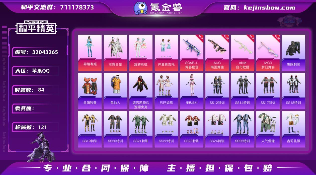 苹果 手Q-4粉装-5特效枪-0载具-0粉色飞行器-39752热力值-6王牌印记-84套装-121枪皮 【热门品类】:套装-龟仙人,熔岩游骑兵连帽夹克 【粉色套装】:粉装-冰霜白皇,粉装-旋转彩虹,粉装-仲夏莫吉托,角色-异瞳寒姬 【粉色枪皮等级】:AKM-白勺歌姬(五级),SCAR-L-青春物语(七级),AUG-南国舞曲(六级),Mk14-福马献瑞(二级),MG3-梦幻舞会(五级) 【粉色枪皮】:AKM-白勺歌姬,SCAR-L-青春物语,AUG-南国舞曲,Mk14-福马献瑞,MG3-梦幻舞会 【粉色降落伞】:甜蜜誓约降落伞,海渊国主降落伞,旋转彩虹降落伞,第五大道降落伞,未来歌姬降落伞,脆鲨七海降落伞,炫彩糖果降落伞 【稀有套装】:套装-龟仙人,套装-巳巳如意,套装-马上来财,角色-蜜桃派对 【稀有枪皮】:AKM-墨染幽兰,AKM-彩虹符号,AKM-灼热熔岩,AKM-破晓战魂,AKM-缤纷海域,AKM-胡桃卫兵,M16A4-幻世战舞者,M16A4-甜心亚梦,SCAR-L-炫彩节奏,SCAR-L-玉兔迎春,M416-糯团青竹,M416-红色方程式,M416-蓝色火焰,GROZA-懵萌河马,GROZA-田园牧歌,AUG-天降萌叽,AUG-耀粉歌者,QBZ-彩虹符号,QBZ-未来歌姬,M762-天降萌叽,M762-甜心宝贝,Mk47-妙红点点,G36C-懵萌河马,AC-VAL-天降萌叽,AC-VAL-彩虹甜喵,AC-VAL-甜心亚梦,蜜獾-娇憨猪猪,UZI-娇憨猪猪,UZI-影袭,UMP45-海渊国主,UMP45-涂山之恋,UMP45-炫光之旅,UMP45-生命誓言,Vector-生命誓言,Vector-田园牧歌,Vector-香水柠檬,汤姆逊-天降萌叽,汤姆逊-奇异狩猎者,汤姆逊-暗夜鎏金,汤姆逊-环太平洋,汤姆逊-耀粉歌者,Kar98K-深海曼妙,Kar98K-炫彩节奏,M24-歌者泠鸢,M24-香水柠檬,AWM-炙焰牛王,SKS-炫彩节奏,SKS-青丘仙客,VSS-田园牧歌,Mini14-涂山之恋,Mini14-炫彩节奏,Mini14-耀粉歌者,SLR-娇憨猪猪,SLR-彩虹符号,莫辛纳甘-懵萌河马,莫辛纳甘-银碳小老虎,AMR-...