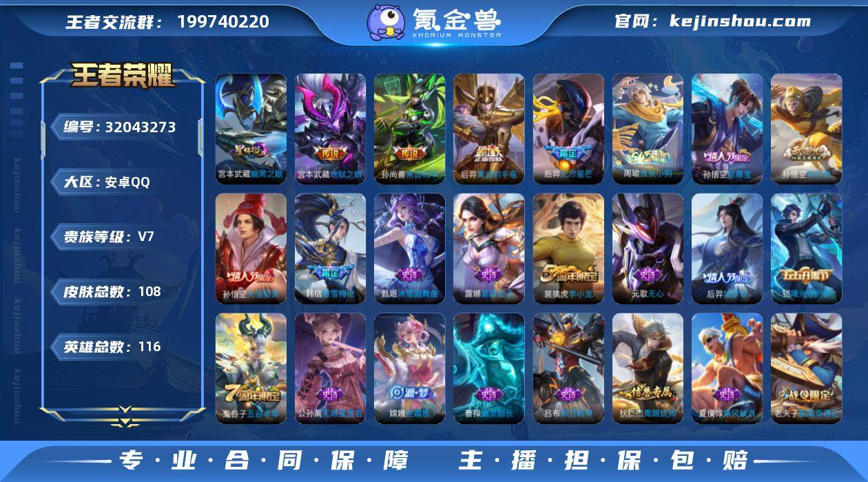 实名: 不可修改 贵族等级: V7 英雄数: 116 皮肤数: 108 星传说: 幽冥之眼 传说皮: 黄金射手座,末日机甲-孙尚香,地狱之眼 限定皮: 李小龙,至尊宝,如梦令-后羿,大圣娶亲,孙行者,傲雪梅枪,匿光决锋者,无尽星芒,五谷丰年 亮点: 【AZQ】【营地:1643525058】