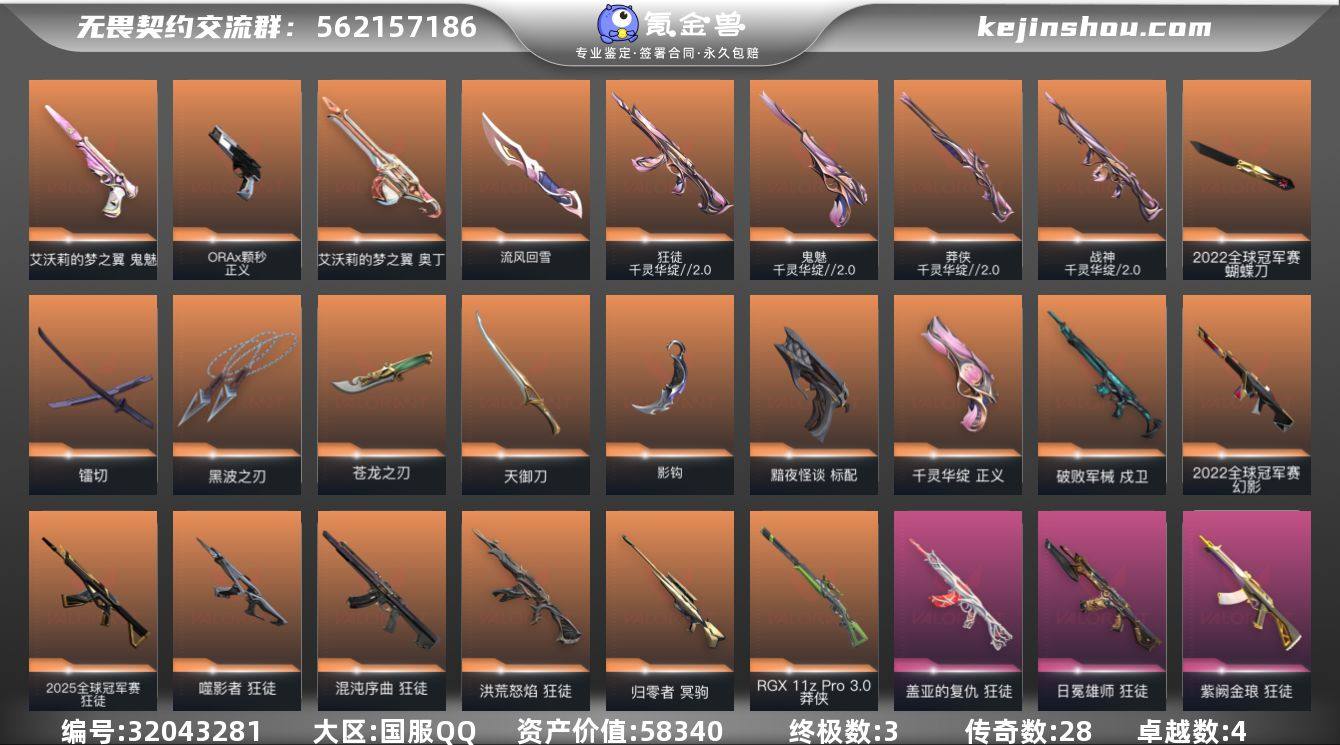 【自带包赔 可赔三倍】:22+25冠军多热门刀皮号,库存价值58340 【限定】: 2025全球冠军赛 狂徒, 2022全球冠军赛 幻影, 2022全球冠军赛 蝴蝶刀, 5周年//公测重制版 苍龙之刃 【近战】: 流风回雪, 镭切, 影钩, 黑波之刃, 2022全球冠军赛 蝴蝶刀, 5周年//公测重制版 苍龙之刃, 天御刀 【狂徒】: 混沌序曲 狂徒, 千灵华绽//2.0 狂徒, 2025全球冠军赛 狂徒, 洪荒怒焰 狂徒, 日冕雄师 狂徒, 紫阙金琅 狂徒, 盖亚的复仇 狂徒, 噬影者 狂徒 【幻影】: 2022全球冠军赛 幻影 【冥驹】: 归零者 冥驹, 堕天遗武 冥驹 【正义】: ORA x 颗秒 正义, 千灵华绽 正义 【戍卫】: 破败军械 戍卫 【鬼魅】: 千灵华绽//2.0 鬼魅, 艾沃莉的梦之翼 鬼魅 【标配】: 黯夜怪谈 标配 【战神】: 千灵华绽//2.0 战神 【莽侠】: 千灵华绽//2.0 莽侠, RGX 11z Pro//3.0 莽侠 【充值总皮肤】: 艾沃莉的梦之翼 奥丁, 混沌序曲 狂徒, 千灵华绽//2.0 战神, 流风回雪, 千灵华绽//2.0 莽侠, 千灵华绽//2.0 鬼魅, 千灵华绽//2.0 狂徒, ORA x 颗秒 正义, RGX 11z Pro//3.0 莽侠, 2025全球冠军赛 狂徒, 镭切, 黯夜怪谈 标配, 归零者 冥驹, 洪荒怒焰 狂徒, 破败军械 戍卫, 影钩, 日冕雄师 狂徒, 紫阙金琅 狂徒, 黑波之刃, 2022全球冠军赛 幻影, 2022全球冠军赛 蝴蝶刀, 5周年//公测重制版 苍龙之刃, 艾沃莉的梦之翼 鬼魅, 堕天遗武 冥驹, 千灵华绽 正义, 天御刀, 盖亚的复仇 狂徒, 噬影者 狂徒 【概要】: 总皮肤 122 终极 3传奇 28 卓越 4刀皮 7英雄 28 LV345 历史最高:铂金 当前段位:铂金 已使用1410 R点 剩余 55R点 可二次 卡面、挂饰、其他皮肤请看截图 道具、段位等以实际验号为准。如账号因没有维护,赛季更新等不可抗因素发生变化,不属于账号质量问题"