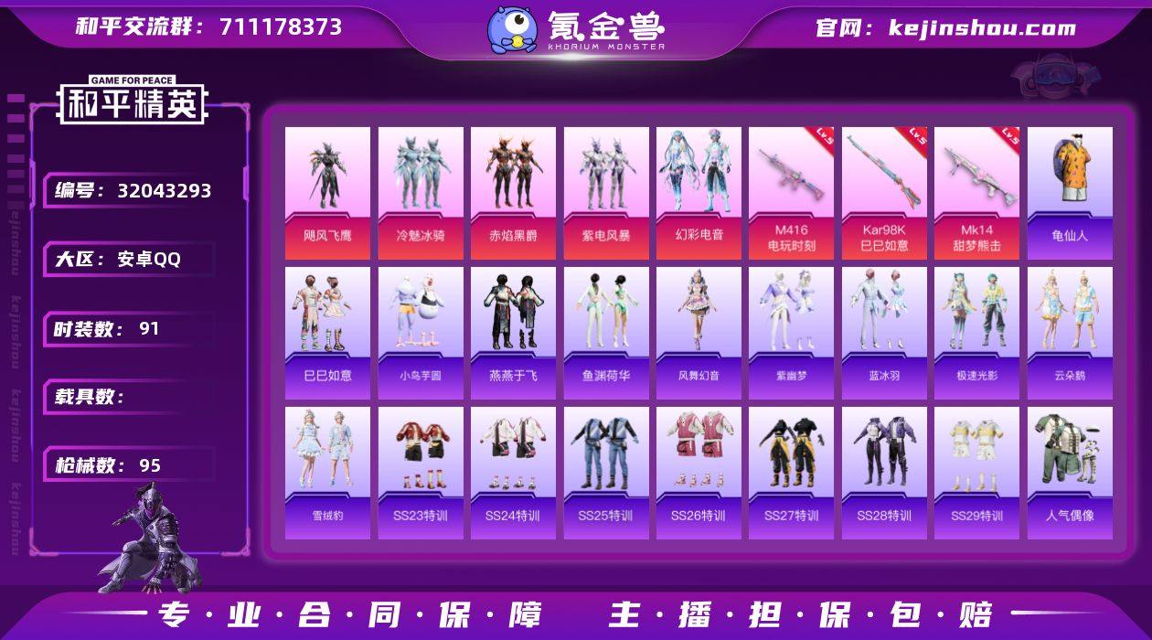 安卓 手Q-5粉装-3特效枪-0载具-27099热力值-2印记-91套装-95枪皮 【特效枪等级】:M416-电玩时刻(五级),Kar98K-巳巳如意(五级),MG3-辉羽雀灵(五级Mk14-甜梦熊击) 【优质套装】:粉装-飓风飞鹰,粉装-冷魅冰骑,粉装-赤焰黑爵,粉装-紫电风暴,粉装-幻彩电音 【稀有套装】:套装-龟仙人,套装-巳巳如意,套装-小鸟芋圆,套装-燕燕于飞,套装-鱼渊荷华,套装-风舞幻音,套装-紫幽梦,套装-蓝冰羽,套装-极速光影,套装-云朵鹅,套装-雪绒豹 【优质武器皮肤】:M416-电玩时刻,Kar98K-巳巳如意,Mk14-甜梦熊击 【稀有武器皮肤】:AKM-破晓战魂,AKM-龙的传人,SCAR-L-红色方程式,M416-糯团青竹,M416-蓝色火焰,GROZA-懵萌河马,AUG-天降萌叽,AUG-耀粉歌者,M762-天降萌叽,M762-云朵鹅,G36C-冷魅冰骑,G36C-懵萌河马,G36C-星穹咏叹调,蜜獾-天降萌叽,UZI-啾咪啾咪,UZI-天降萌叽,UZI-红色方程式,UMP45-夜灯,UMP45-生命誓言,Vector-焰鹰斗篷,Vector-彩虹符号,汤姆逊-耀粉歌者,MP5K-飒粉甜心,P90-巳巳如意,Kar98K-彩虹符号,M24-奇异狩猎者,AWM-焰鹰斗篷,VSS-彩虹符号,Mini14-绯穹魔姬,QBU-飒粉甜心,莫辛纳甘-懵萌河马,SVD-云朵鹅,S686-巳巳如意,S12K-破晓战魂,S12K-夜灯,DBS-焰鹰斗篷,SPAS-12-云朵鹅,M249-冷魅冰骑,M249-彩虹符号,M249-糯团青竹,DP-28-焰鹰斗篷,MG3-幻世战舞者,PKM-懵萌河马,PKM-小狗蛇点点,短管霰弹-竹节火铳,短管霰弹-星穹咏叹调,沙漠之鹰-云朵鹅,TMP-9-江南烟雨,战术弩-江南烟雨,大砍刀-云朵鹅,大砍刀-黑金刀,燃烧瓶-甜梦桃焰,破片手榴弹-巳巳如意 【其他套装】:套装-SS23特训,套装-SS24特训,套装-SS25特训,套装-SS26特训,套装-SS27特训,套装-SS28特训,套装-SS29特训,套装-人气偶像,套装-光之冒险,套装-千禧之恋,套装-完美偶像,套装-幻影...