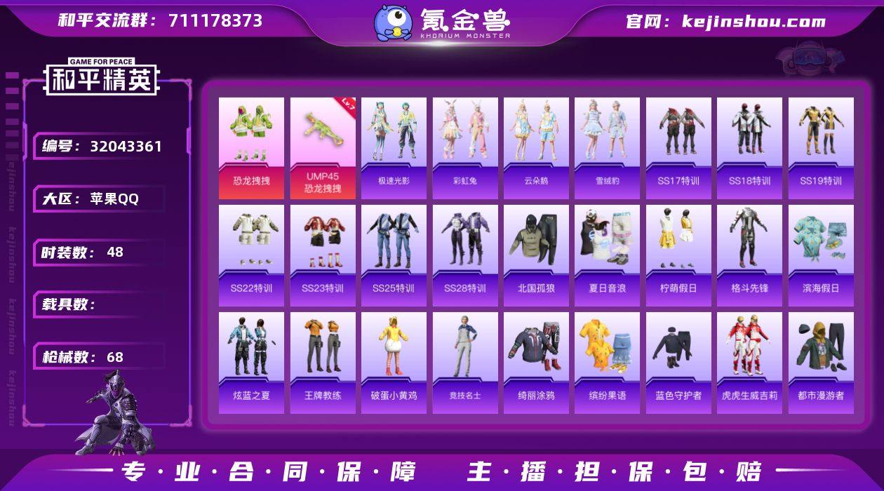 苹果 手Q-1粉装-1特效枪-0载具-22808热力值-2印记-48套装-68枪皮 【特效枪等级】:UMP45-恐龙拽拽(七级) 【优质套装】:粉装-恐龙拽拽 【稀有套装】:套装-极速光影,套装-彩虹兔,套装-云朵鹅,套装-雪绒豹 【优质武器皮肤】:UMP45-恐龙拽拽 【稀有武器皮肤】:AKM-彩虹符号,AKM-恐龙拽拽,AKM-生命誓言,AKM-虎虎生威,SCAR-L-流星咚咚,SCAR-L-炫彩节奏,SCAR-L-黄金龙骨,M416-糯团青竹,M416-蓝色火焰,GROZA-异彩先驱,GROZA-恐龙拽拽,GROZA-田园牧歌,AUG-耀粉歌者,QBZ-彩虹符号,QBZ-飞驰魅影,M762-天降萌叽,M762-瑞龙福将,M762-云朵鹅,Mk47-妙红点点,G36C-暗夜玫瑰,蜜獾-天降萌叽,UZI-天降萌叽,UMP45-蓝色火焰,Vector-田园牧歌,汤姆逊-异彩先驱,MP5K-异彩先驱,P90-飞驰魅影,Kar98K-炫彩节奏,Kar98K-蓝莓炮弹,Kar98K-飞驰魅影,AWM-恐龙拽拽,VSS-田园牧歌,Mini14-异彩先驱,Win94-瑞龙福将,SLR-彩虹符号,AMR-妙红点点,SVD-云朵鹅,SVD-冷漠罗丽,S686-生命誓言,S1897-飞驰魅影,S12K-瑞龙福将,SPAS-12-田园牧歌,SPAS-12-云朵鹅,M249-妙红点点,DP-28-彩虹符号,MG3-妙红点点,MG3-幻世战舞者,MG3-瑞龙福将,MG3-第五大道,沙漠之鹰-云朵鹅,大砍刀-云朵鹅 【其他套装】:套装-SS17特训,套装-SS18特训,套装-SS19特训,套装-SS22特训,套装-SS23特训,套装-SS25特训,套装-SS28特训,套装-北国孤狼,套装-夏日音浪,套装-柠萌假日,套装-格斗先锋,套装-滨海假日,套装-炫蓝之夏,套装-王牌教练,套装-破蛋小黄鸡,套装-竞技名士,套装-绮丽涂鸦,套装-缤纷果语,套装-蓝色守护者,套装-虎虎生威吉莉,套装-都市漫游者,套装-长空猛禽,套装-飞行日记,套装-魅力单车,套装-龙的传人,套装-醒狮腾龙,套装-瑞龙福将,套装-团圆交子,套装-电音精灵,套装-异彩先驱,套装-霓...