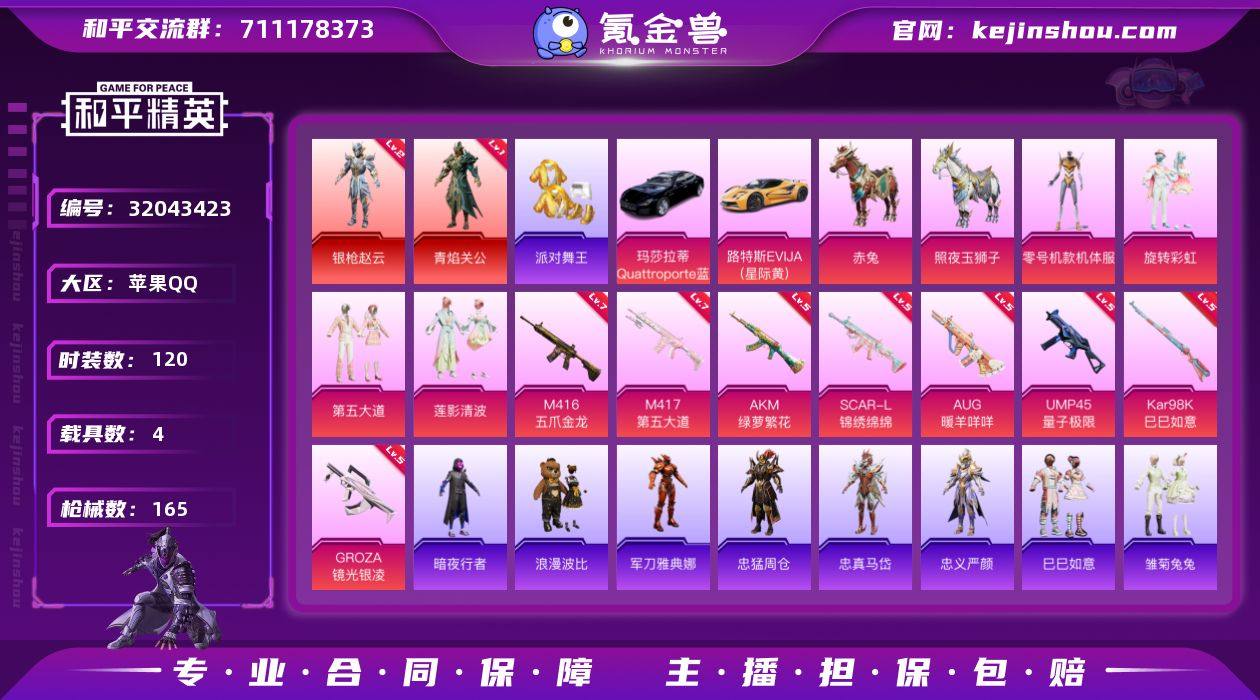 【4粉装-8特效枪-4载具 玛莎拉蒂 路特斯 银枪赵云二级 青焰关公一级】:苹果 手Q-4粉装-8特效枪-4载具-59978热力值-9印记-120套装-165枪皮 【角色神装】:角色-银枪赵云,角色-青焰关公 【角色神装等级】:角色-银枪赵云(二级角色-银枪赵云),角色-青焰关公(一级角色-青焰关公) 【稀有载具】:路特斯EVIJA(星际黄),玛莎拉蒂Quattroporte(夜幕蓝),赤兔,照夜玉狮子 【特效枪等级】:AKM-绿萝繁花(五级AKM-绿萝繁花),SCAR-L-锦绣绵绵(五级SCAR-L-锦绣绵绵),M416-五爪金龙(七级M416-五爪金龙),GROZA-镜光银凌(五级GROZA-镜光银凌),AUG-暖羊咩咩(五级AUG-暖羊咩咩),UMP45-量子极限(五级UMP45-量子极限),Kar98K-巳巳如意(五级Kar98K-巳巳如意),M417-第五大道(七级M417-第五大道) 【优质套装】:角色-零号机款机体服,粉装-旋转彩虹,粉装-第五大道,粉装-莲影清波 【稀有套装】:套装-巳巳如意,套装-雏菊兔兔,套装-萝兰蝴蝶,套装-小熊娃娃,角色-多纳泰罗,套装-火种守卫者,套装-糖糖葫芦,套装-青团波波,套装-棉花软糖,角色-摩登魅猫,套装-燕燕于飞,套装-鱼渊荷华,角色-风玲,套装-晶辉守护,套装-樱梦幻音,套装-紫幽梦,套装-蓝冰羽 【优质武器皮肤】:AKM-绿萝繁花,SCAR-L-锦绣绵绵,M416-五爪金龙,AUG-暖羊咩咩,UMP45-量子极限,Kar98K-巳巳如意,M417-第五大道 【稀有武器皮肤】:AKM-墨染幽兰,AKM-彩虹符号,AKM-星之彼岸,AKM-生命誓言,AKM-龙的传人,M16A4-千金淑猫,SCAR-L-玉兔迎春,SCAR-L-红色方程式,M416-暗夜行者,M416-糯团青竹,M416-蓝色火焰,GROZA-恐龙拽拽,GROZA-田园牧歌,AUG-天降萌叽,AUG-甜蜜菠萝,AUG-耀粉歌者,AUG-闲梦青缨,QBZ-彩虹符号,M762-天降萌叽,M762-彩虹符号,G36C-镜域双华,AC-VAL-天降萌叽,AC-VAL-快闪甜心,蜜獾-千面幻镜,蜜獾-天降萌叽...