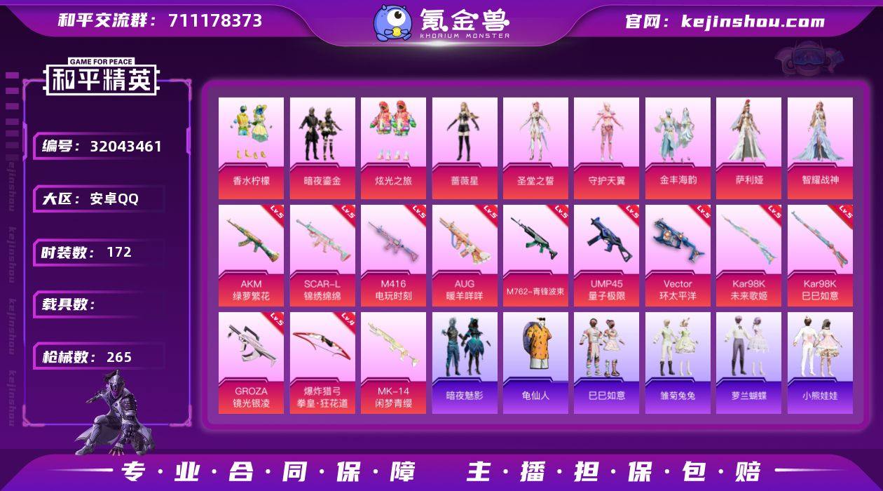 【极品号9粉装-12特效枪Mark.06圣堂之誓智耀战神】:安卓 手Q-9粉装-12特效枪-0载具-85085热力值-13印记-172套装-265枪皮 【特效枪等级】:AKM-绿萝繁花(五级),SCAR-L-锦绣绵绵(五级),M416-电玩时刻(五级),GROZA-镜光银凌(五级),AUG-暖羊咩咩(五级),M762-青锋波束(五级),UMP45-量子极限(五级),Vector-环太平洋(五级),Kar98K-未来歌姬(五级),Kar98K-巳巳如意(五级),爆炸猎弓-拳皇·狂花道(四级) 【优质套装】:粉装-香水柠檬,粉装-暗夜鎏金,粉装-炫光之旅,角色-蔷薇星,角色-圣堂之誓,角色-守护天翼,粉装-金丰海韵,角色-萨利娅,角色-智耀战神 【稀有套装】:套装-龟仙人,套装-巳巳如意,套装-雏菊兔兔,套装-萝兰蝴蝶,套装-小熊娃娃,套装-火种守卫者,套装-糖糖葫芦,套装-青团波波,套装-棉花软糖,角色-摩登魅猫,套装-燕燕于飞,套装-鱼渊荷华,套装-风舞幻音,套装-紫幽梦,套装-蓝冰羽 【优质武器皮肤】:AKM-绿萝繁花,SCAR-L-黄金龙骨,SCAR-L-锦绣绵绵,M416-电玩时刻,AUG-暖羊咩咩,M762-青锋波束,UMP45-量子极限,Vector-环太平洋,Kar98K-未来歌姬,Kar98K-巳巳如意,Mk14-闲梦青缨 【稀有武器皮肤】:AKM-冰凉西瓜,AKM-夜灯,AKM-彩虹符号,AKM-江南烟雨,AKM-灼热熔岩,AKM-生命誓言,AKM-破晓战魂,AKM-萌趣颜团子,AKM-虎虎生威,AKM-霓虹街区,AKM-龙的传人,M16A4-幻世战舞者,M16A4-甜心亚梦,M16A4-红色方程式,M16A4-蓝色火焰,M16A4-千金淑猫,SCAR-L-玉兔迎春,SCAR-L-红色方程式,SCAR-L-黄金龙骨,M416-夜灯,M416-糯团青竹,M416-红色方程式,M416-蓝色火焰,GROZA-异彩先驱,GROZA-彩虹符号,GROZA-懵萌河马,GROZA-治愈之星,GROZA-田园牧歌,GROZA-黑色刀锋,AUG-甜蜜菠萝,AUG-耀粉歌者,AUG-青春冒险家,QBZ-彩虹符号,QBZ-洛神天依,QBZ-飞驰魅影,M762-天降...