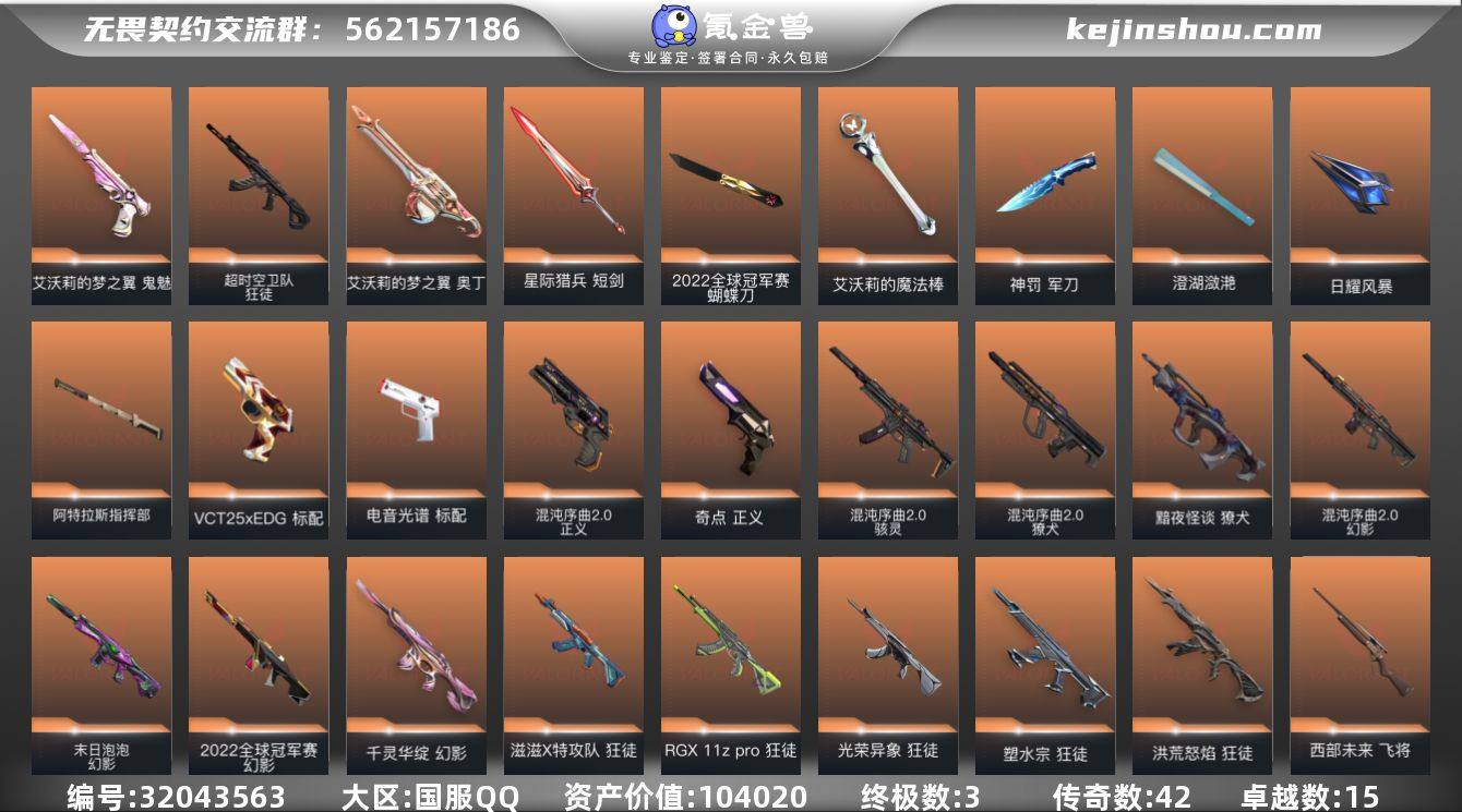 段位: 未定级 亮点皮肤: 幻影-2022全球冠军赛,蝴蝶刀-2022全球冠军赛 套装: 2022全球冠军赛,掠影2.0套装 近战武器皮肤: 军刀-神罚,澄湖潋滟,艾沃莉的魔法棒,日耀风暴,阿特拉斯指挥部,星际猎兵 短剑 步枪皮肤: 狂徒-紫阙金琅,狂徒-盖亚的复仇,幻影-侦察力量,戍卫-天界神兵,狂徒-塑水宗,狂徒-洪荒怒焰,幻影-天界神兵2.0,幻影-千灵华绽,狂徒-日冕雄师,獠犬-黯夜怪谈,戍卫-掠影,狂徒-RGX 11z pro,狂徒-光荣异象,狂徒-超时空卫队,幻影-掠影2.0,狂徒-滋滋X特攻队,幻影-末日泡泡,幻影-混沌序曲2.0,獠犬-混沌序曲2.0 佩枪皮肤: 正义-奇点,短炮-海洋之星,鬼魅-艾沃莉的梦之翼,正义-掠影,标配-VCT25xEDG,标配-电音光谱,鬼魅-掠影2.0,正义-混沌序曲2.0 狙击枪皮肤: 冥驹-偃月苍龙,冥驹-起源,冥驹-千灵华绽,冥驹-全息波普//2.0,飞将-西部未来,莽侠-神中神罚,冥驹-滋滋X特攻队 冲锋枪皮肤: 骇灵-掠影2.0,骇灵-混沌序曲2.0 机枪皮肤: 战神-奇点,奥丁-艾沃莉的梦之翼,奥丁-掠影2.0