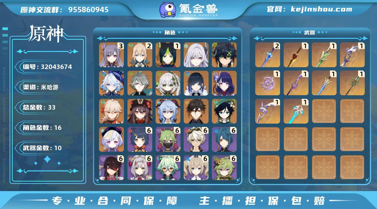 邮箱: 不送邮/死邮 总黄数: 33 冒险等级: 59 3命金色角色: 三命刻晴 2命金色角色: 二命琴 1命金色角色: 一命提纳里 0命金色角色: 温迪,枫原万叶,七七,钟离,甘雨,胡桃,雷电将军,夜兰,纳西妲,艾尔海森,芙宁娜,基尼奇,丝柯克 拥有武器: 和璞鸢,阿莫斯之弓,天空之刃,薙草之稻光,不灭月华,苍古自由之誓,波乱月白经津,若水,裁叶萃光,有乐御簾切 2精武器: 波乱月白经津 1精武器: 和璞鸢,阿莫斯之弓,天空之刃,薙草之稻光,不灭月华,苍古自由之誓,若水,裁叶萃光,有乐御簾切