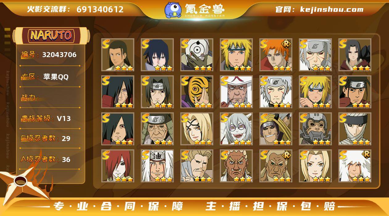 实名:可二次实名 贵族等级:V11 战力值:20631212 S忍数:42 A忍数:58 五星纲手,四星宇智波鼬「须佐能乎」,四星猿飞日斩,四星大蛇丸,三星漩涡鸣人·宇智波佐助,三星宇智波斑「五影会谈」,三星波风水门「九喇嘛连结」,三星自来也「传说中的三忍」,三星旗木卡卡西「须佐能乎」,三星宇智波止水「须佐能乎」,三星艾「忍界大战」,三星大筒木桃式,三星宇智波斑「秽土转生·解」,三星千手柱间·木叶创立,三星宇智波佐助「永恒万花筒」,三星神秘面具男「红夜之刃」,三星宇智波带土「忍界大战」,三星宇智波斑「白面具」,三星波风水门,三星漩涡鸣人「九喇嘛连结」,三星迈特凯「死门」,三星千手扉间「秽土转生」,三星宇智波鼬「秽土转生」,三星宇智波斑「秽土转生」,三星神秘面具男,三星千手柱间「秽土转生」,三星千手扉间,三星波风水门「秽土转生」,三星千手柱间,三星宇智波斑,三星猿飞日斩「秽土转生」,三星纲手「百豪」,三星药师兜「仙人模式」,三星无「二代目土影」,三星长门「秽土转生」,三星佩恩「天道」,三星自来也,三星自来也「仙人模式」,三星艾「四代目雷影」,三星春野樱「忍界大战」,三星大筒木金式「博人传」,三星自来也「舞之豪杰」 五星蝎,五星干柿鬼鲛,五星猿飞阿斯玛,五星迈特凯,四星飞段「死司凭血」,四星飞段,四星我爱罗「疾风传」,三星猿飞木叶丸「博人传」,三星我爱罗「忍界大战」,三星迪达拉,三星宇智波鼬,二星旗木卡卡西「神威对决」,二星小南「神驹佑将」,二星迈特凯「青春爆炸」,二星巳月「仙人模式」,二星大野木「侠隐江湖」,二星机械鸣人「初始形态」,二星土台「忍界大战」,二星桃地再不斩「秽土转生」,二星宇智波泉奈,二星蝎「绯流琥」,二星不动,二星角都「秽土转生」,二星李洛克「忍界大战」,二星旗木卡卡西「幻之真容」,二星漩涡博人「桃式显现」,二星日向宁次·忍界大战,二星我爱罗「新春限定」,二星不缘,二星长十郎「六代目水影」,二星宇智波止水,二星长门「青年」,二星佩恩·六道「漂泊浪客」,二星艾「青年」,二星迪达拉「新春限定」,二星达鲁伊「五代目雷影」,二星不风,二星波风水门「青年」,二星奇拉比「忍界大战」,二星黑土「博人传」,二星宇智波佐助「须佐能乎」,二星迪达拉「秽土转生」,二星宇智波带土「暴怒」,二星漩涡鸣人「九尾查克拉」,二星千代「近松十人卫」,二星药师兜「半蛇斗篷」,二星地陆,二星秋道丁次「忍界大战」,二星大蛇丸「晓」,二星春野樱「百豪」,二星波风水门「新春限定」,二星照美冥「五代目水影」,二星宇智波佐助「万花筒写轮眼」,二星奇拉比,二星漩涡鸣人「仙人模式」,二星旗木卡卡西「万花筒写轮眼」,二星角都「地怨虞」,二星小南 卖家说:40多s人发帖有了,点卷忍者多