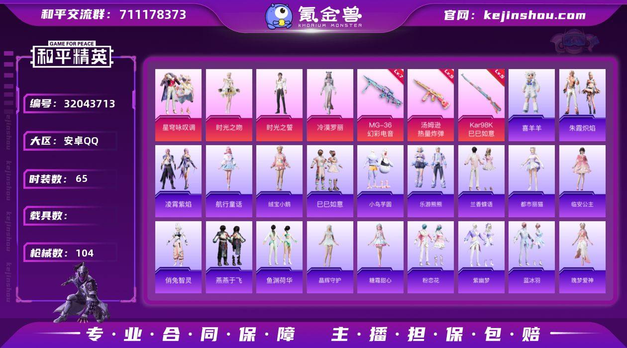 安卓 手Q-4粉装-3特效枪-0载具-28650热力值-5印记-65套装-104枪皮 【特效枪等级】:汤姆逊-热量炸弹(五级),Kar98K-巳巳如意(五级),MG-36-幻彩电音(七级) 【优质套装】:粉装-星穹咏叹调,角色-时光之吻,角色-时光之誓,角色-冷漠罗丽 【稀有套装】:套装-航行童话,套装-绒宝小鹅,套装-巳巳如意,套装-小鸟芋圆,套装-乐游熊熊,套装-兰香蝶语,角色-都市丽猫,角色-临安公主,角色-俏兔智灵,套装-燕燕于飞,套装-鱼渊荷华,套装-晶辉守护,角色-糖霜甜心,套装-粉恋花,套装-紫幽梦,套装-蓝冰羽,角色-瑰梦爱神,套装-星渊小夜曲,套装-极速光影,套装-彩虹兔,套装-云朵鹅,套装-雪绒豹,套装-诡诞巡游,角色-魔药课室,角色-绛羽幽主,套装-朱霞炽焰,套装-凌霄紫焰,玩偶服-喜羊羊 【优质武器皮肤】:汤姆逊-热量炸弹,Kar98K-巳巳如意,MG-36-幻彩电音 【稀有武器皮肤】:AKM-破晓战魂,M16A4-最终圣卫者,SCAR-L-玉兔迎春,SCAR-L-冷漠罗丽,M416-萌萌史莱姆,GROZA-田园牧歌,AUG-耀粉歌者,QBZ-魔药课室,M762-彩虹符号,M762-云朵鹅,G36C-桃粉嫣然,蜜獾-天降萌叽,蜜獾-绯穹魔姬,蜜獾-折梦之诗,ARX-凌霄紫焰,UZI-天降萌叽,UZI-魔药课室,UZI-月影灵韵,UMP45-绒宝小鹅,Vector-生命誓言,汤姆逊-耀粉歌者,汤姆逊-樱桃泡泡,汤姆逊-幻星舰长,野牛-最终圣卫者,AKS-74U-鬼刀,JS9-凌霄紫焰,P90-巳巳如意,Kar98k-最终圣卫者,M24-幻彩电音,VSS-彩虹符号,Mini14-耀粉歌者,Mini14-辉羽雀灵,Mk14-魔药课室,Mk14-幻星舰长,Win94-晶梦幻蝶,AMR-时光之誓,SVD-云朵鹅,S686-生命誓言,S686-巳巳如意,S686-千金淑猫,S12K-夜灯,DBS-幻彩电音,DBS-月影灵韵,SPAS-12-云朵鹅,M249-破晓战魂,M249-糯团青竹,MG3-智耀战神,MG-36-凌霄紫焰,P92-凌霄紫焰,R45-幻彩电音,短管霰弹-星穹咏叹...