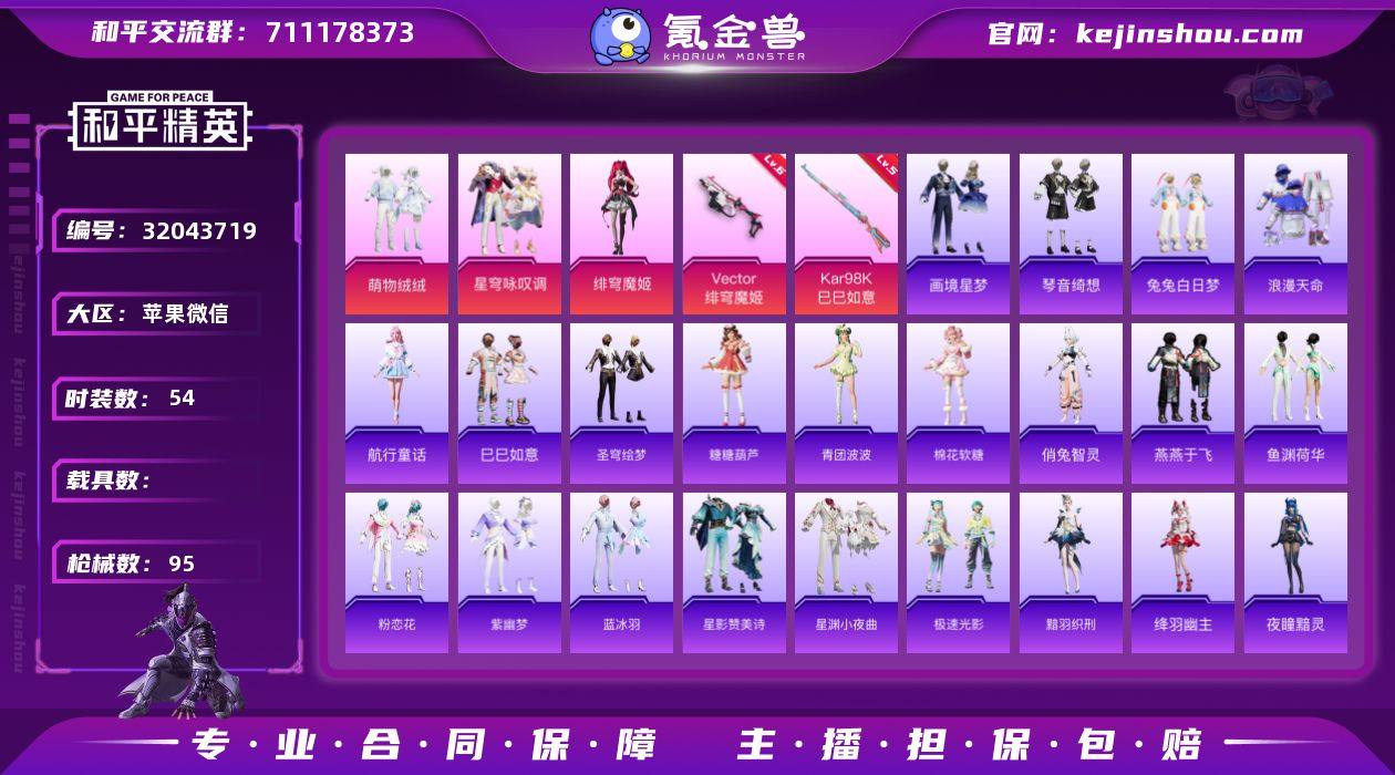 苹果微信 ZWA109【3粉装2特效枪1粉色飞行器 萌物绒绒/星穹咏叹调/绯穹魔姬/浪漫天命/航行童话/俏兔智灵/星影赞美诗/星渊小夜曲/黯羽织刑/绛羽幽主/夜瞳黯灵/蝶吟花词/兔兔白日梦】23987热力值-4王牌印记-54套装-95枪皮 【热门品类】:套装-浪漫天命 【粉色套装】:粉装-萌物绒绒,粉装-星穹咏叹调,角色-绯穹魔姬 【粉色枪皮等级】:Vector-绯穹魔姬(六级),Kar98K-巳巳如意(五级) 【粉色枪皮】:Vector-绯穹魔姬,Kar98K-巳巳如意 【粉色飞行器】:萌物绒绒飞行器