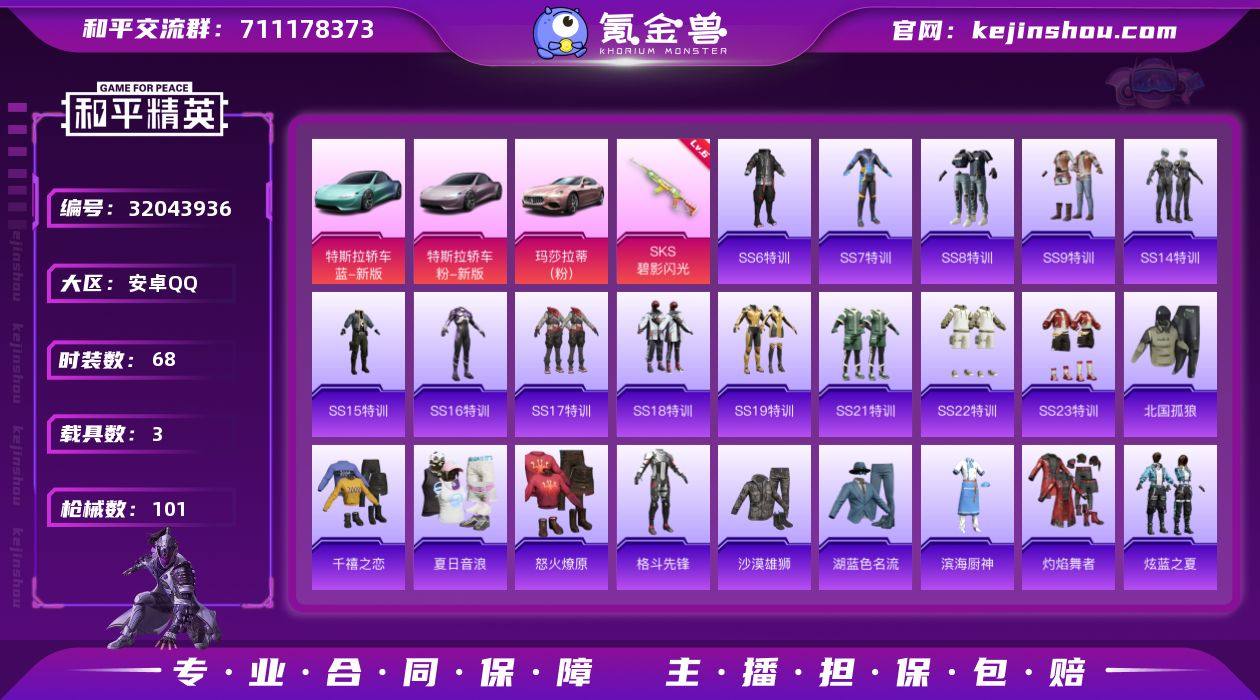 1特3载具粉玛莎 安卓 手Q-0粉装-1特效枪-3载具-1粉色飞行器-33865热力值-8王牌印记-68套装-101枪皮 【粉色枪皮等级】:SKS-碧影闪光(六级) 【粉色载具】:特斯拉Roadster(水滴蓝),特斯拉Roadster(沁心粉),玛莎拉蒂Ghibli(粉) 【粉色枪皮】:SKS-碧影闪光 【粉色飞行器】:炫彩糖果飞行器 【粉色降落伞】:焰龙焚天降落伞,旋转彩虹降落伞,炫光之旅降落伞,炫彩糖果降落伞 【稀有套装】:套装-炫彩糖果 【稀有枪皮】:AUG-冰晶雪宝,AKM-夜灯,AKM-彩虹符号,AKM-破晓战魂,AKM-萌趣颜团子,AKM-虎虎生威,AKM-霓虹街区,M16A4-幻世战舞者,SCAR-L-炫彩节奏,M416-红色方程式,M416-魔法学院,GROZA-异彩先驱,GROZA-恐龙拽拽,GROZA-治愈之星,GROZA-田园牧歌,AUG-耀粉歌者,QBZ-彩虹符号,QBZ-洛神天依,QBZ-飞驰魅影,M762-天降萌叽,M762-瑞龙福将,M762-绯红前夜,M762-镭射皇者,蜜獾-娇憨猪猪,UZI-天降萌叽,UZI-娇憨猪猪,UZI-炫彩节奏,UMP45-生命誓言,UMP45-蓝色火焰,Vector-彩虹符号,Vector-暗夜玫瑰,Vector-治愈之星,Vector-生命誓言,Vector-田园牧歌,汤姆逊-天降萌叽,汤姆逊-异彩先驱,汤姆逊-耀粉歌者,MP5K-异彩先驱,MP5K-怪笑疯兔,P90-飞驰魅影,Kar98K-彩虹符号,Kar98K-红色方程式,Kar98K-飞驰魅影,M24-治愈之星,SKS-夜灯,SKS-炫彩节奏,VSS-田园牧歌,Mini14-异彩先驱,Mini14-炫彩节奏,Mini14-耀粉歌者,Mk14-治愈之星,Win94-瑞龙福将,SLR-娇憨猪猪,S686-生命誓言,S686-红色方程式,S1897-飞驰魅影,S12K-瑞龙福将,S12K-破晓战魂,S12K-夜灯,S12K-娇憨猪猪,SPAS-12-田园牧歌,M249-糯团青竹,DP-28-彩虹符号,MG3-幻世战舞者,MG3-瑞龙福将,沙漠之鹰-旋转彩虹 【其他套装】:套装-SS6特训,套装-SS7特训,套装-SS8特训,套装-SS9特训,套装-SS14特训,套装-...