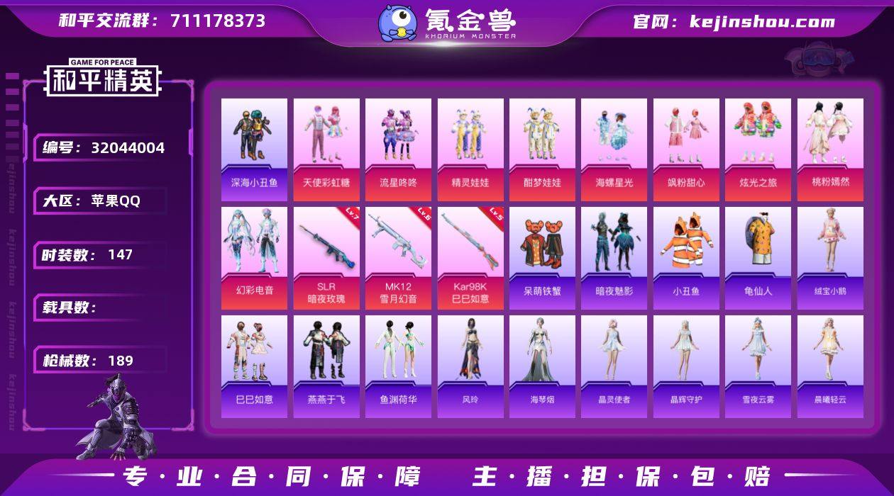苹果 手Q-9粉装-3特效枪-0载具-66103热力值-10印记-147套装-189枪皮 【特效枪等级】:Kar98K-巳巳如意(五级),SLR-暗夜玫瑰(七级),MK12-雪月幻音(六级) 【优质套装】:粉装-天使彩虹糖,粉装-流星咚咚,粉装-精灵娃娃,粉装-酣梦娃娃,粉装-海螺星光,粉装-飒粉甜心,粉装-炫光之旅,粉装-桃粉嫣然,粉装-幻彩电音 【稀有套装】:套装-龟仙人,套装-绒宝小鹅,套装-巳巳如意,套装-燕燕于飞,套装-鱼渊荷华,角色-风玲,角色-海琴烟,套装-晶灵使者,套装-晶辉守护,套装-雪夜云雾,套装-晨曦轻云,套装-风舞幻音,套装-樱梦幻音,套装-粉恋花,套装-紫幽梦,套装-蓝冰羽,角色-瑰梦爱神,套装-果冻柠檬,套装-极速光影 【优质武器皮肤】:Kar98K-巳巳如意,SLR-暗夜玫瑰,MK12-雪月幻音 【稀有武器皮肤】:AKM-小鹦鹉BEBE,AKM-影袭,AKM-灼热熔岩,AKM-缤纷海域,AKM-萌趣颜团子,AKM-虎虎生威,AKM-星月云朵,M16A4-幻世战舞者,M16A4-甜心亚梦,SCAR-L-暗夜玫瑰,SCAR-L-炫彩节奏,SCAR-L-玉兔迎春,SCAR-L-红色方程式,M416-彩虹嘻嘻猴,M416-糯团青竹,M416-蓝色火焰,GROZA-彩虹符号,GROZA-影袭,GROZA-懵萌河马,GROZA-田园牧歌,GROZA-荧海星豚,GROZA-晶梦幻蝶,AUG-天降萌叽,AUG-海螺星光,AUG-耀粉歌者,AUG-青春冒险家,QBZ-彩虹符号,QBZ-银碳小老虎,M762-天降萌叽,M762-彩虹甜喵,M762-彩虹符号,M762-瑞龙福将,M762-甜心宝贝,M762-第五大道,Mk47-妙红点点,Mk47-粉色回忆,Mk47-青春冒险家,G36C-懵萌河马,G36C-暗夜玫瑰,AC-VAL-天降萌叽,AC-VAL-甜心亚梦,蜜獾-垂柳戏鸭,蜜獾-天降萌叽,蜜獾-娇憨猪猪,UZI-天降萌叽,UZI-娇憨猪猪,UZI-影袭,UZI-炫彩节奏,UZI-红色方程式,UMP45-仲夏莫吉托,UMP45-夜灯,UMP45-生命誓言,UMP45-粉色回忆,UMP45-蓝色火焰,UMP45-绒宝小鹅,Vecto...