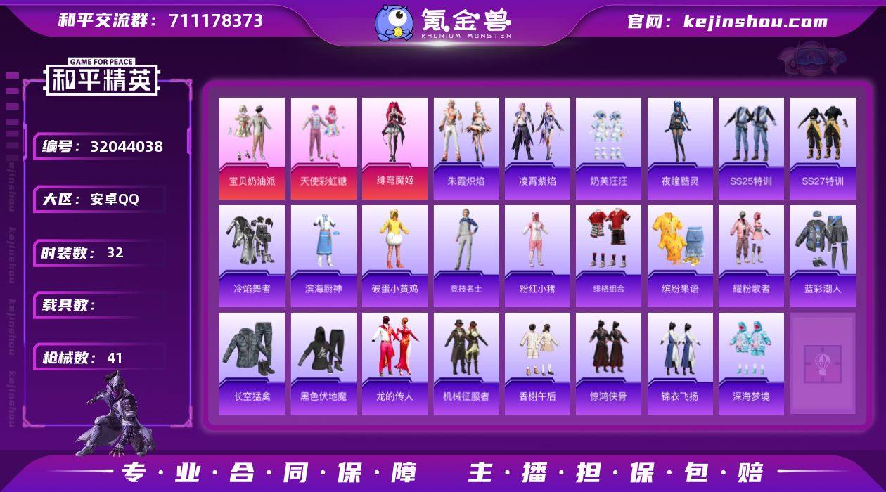 安卓 手Q-3粉装-0特效枪-0载具-10863热力值-2印记-32套装-41枪皮 【优质套装】:粉装-宝贝奶油派,粉装-天使彩虹糖,角色-绯穹魔姬 【稀有套装】:角色-夜瞳黯灵,套装-朱霞炽焰,套装-凌霄紫焰 【稀有武器皮肤】:AKM-龙的传人,M416-糯团青竹,M416-蓝色火焰,AUG-天降萌叽,QBZ-彩虹符号,M762-甜心宝贝,Mk47-炫光之旅,Mk47-粉色回忆,ARX-凌霄紫焰,UZI-啾咪啾咪,UZI-天降萌叽,UMP45-炫光之旅,UMP45-生命誓言,汤姆逊-天降萌叽,JS9-凌霄紫焰,Kar98K-彩虹符号,Mini14-炫彩节奏,M417-惊鸿侠骨,M200-惊鸿侠骨,SVD-冷漠罗丽,DBS-圣堂之誓,DBS-第五大道,AA12-G-炫光之旅,MG3-幻世战舞者,MG3-惊鸿侠骨,MG-36-凌霄紫焰,P92-凌霄紫焰,战术弩-江南烟雨,爆炸猎弓-惊鸿侠骨,平底锅-凌霄紫焰 【其他套装】:套装-SS25特训,套装-SS27特训,套装-冷焰舞者,套装-滨海厨神,套装-破蛋小黄鸡,套装-竞技名士,套装-粉红小猪,套装-绯格组合,套装-缤纷果语,套装-耀粉歌者,套装-蓝彩潮人,套装-长空猛禽,套装-黑色伏地魔,套装-龙的传人,套装-机械征服者,套装-奶芙汪汪,套装-香榭午后,套装-惊鸿侠骨,套装-锦衣飞扬,套装-深海梦境 【优质降落伞】:甜心宝贝降落伞,绝色倾城降落伞 【稀有头盔】:甜心宝贝头盔(1级) 【稀有背包】:甜心宝贝背包(3级),甜心宝贝背包(2级),甜心宝贝背包(1级) 【营地ID】:950586308