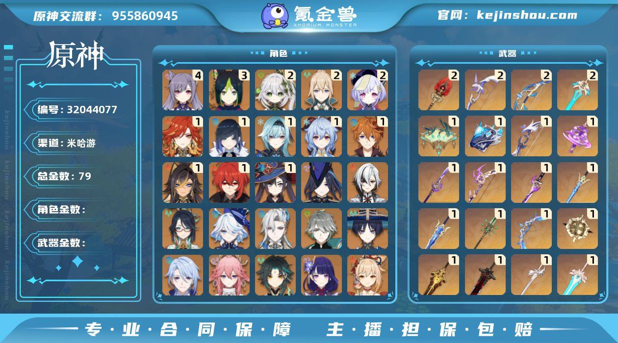 【原神】冒险等级:60,五星数量:54,五星角色:刻晴 * 4命,提纳里 * 3命,七七 * 2命,琴 * 2命,纳西妲 * 2命,玛薇卡 * 1命,迪希雅 * 1命,达达利亚 * 1命,迪卢克 * 1命,甘雨 * 1命,莫娜 * 1命,优菈 * 1命,夜兰 * 1命,神里绫华,温迪,宵宫,钟离,八重神子,神里绫人,那维莱特,芙宁娜,闲云,阿蕾奇诺,艾尔海森,流浪者,枫原万叶,魈,克洛琳德,雷电将军__五星武器:阿莫斯之弓 * 2精,护摩之杖 * 2精,天空之刃 * 2精,终末嗟叹之诗 * 2精,苇海信标,万世流涌大典,鹤鸣余音,苍古自由之誓,尘世之锁,飞雷之弦振,风鹰剑,和璞鸢,狼的末路,四风原典,松籁响起之时,天空之傲,天空之脊,天空之翼,雾切之回光,薙草之稻光,冬极白星,神乐之真意,若水__四星角色:班尼特 * 6命,行秋 * 6命,香菱 * 6命,久岐忍 * 6命,珐露珊 * 6命,凝光 * 6命,迪奥娜 * 6命,砂糖 * 6命,莱依拉 * 6命,坎蒂丝 * 6命,芭芭拉 * 6命,早柚 * 6命,托马 * 6命,烟绯 * 6命,重云 * 6命,辛焱 * 6命,诺艾尔 * 6命,罗莎莉亚 * 6命,雷泽 * 6命,菲谢尔 * 6命,北斗 * 6命,琳妮特 * 6命,嘉明 * 6命,鹿野院平藏 * 5命,瑶瑶 * 5命,云堇 * 5命,多莉 * 4命,五郎 * 4命,九条裟罗 * 3命,绮良良 * 3命,菲米尼 * 3命,米卡 * 2命,夏洛蒂 * 2命,卡齐娜 * 1命,柯莱 * 1命,卡维 * 1命,夏沃蕾 * 1命,埃洛伊,奇偶·男性,赛索斯