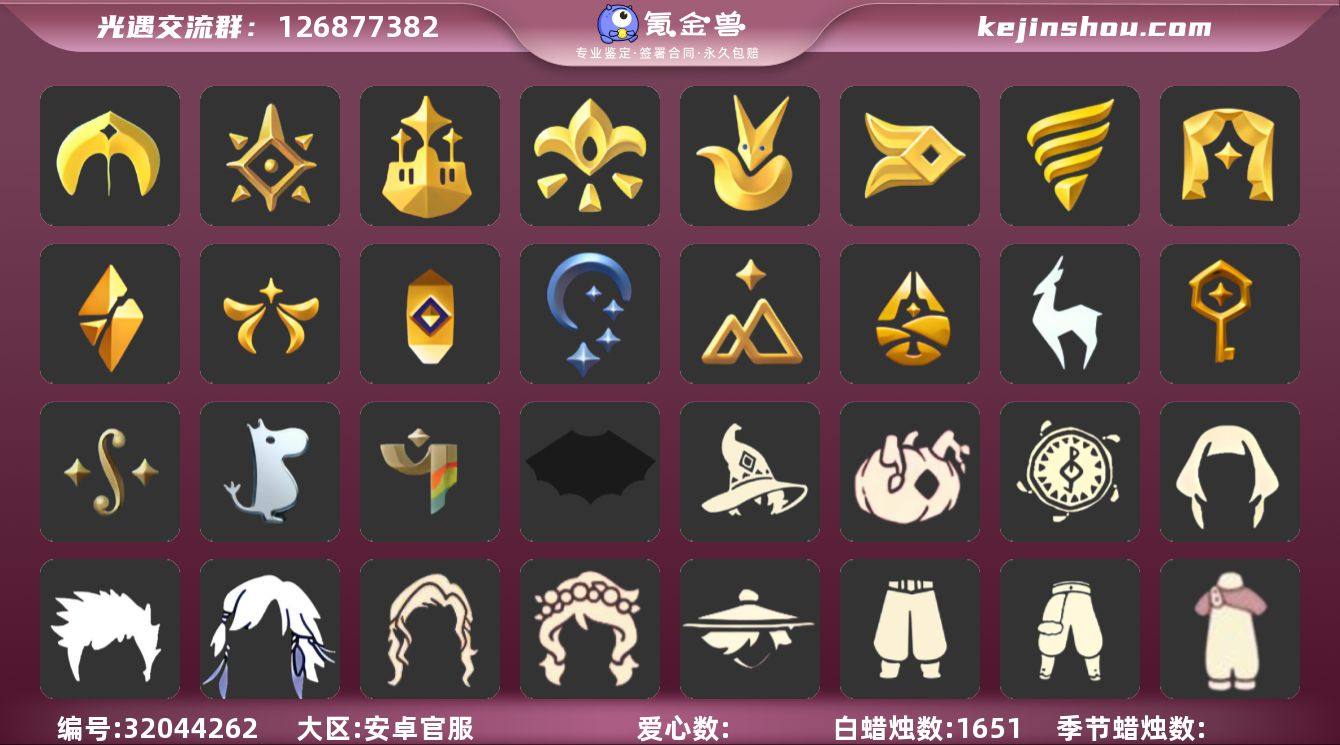 15季9翼白枭蝙蝠斗欧若拉之翼巫树犄角暗彩装扮玫瑰花玉兔拖鞋详情看图,价格可刀 资源:蜡烛 223 爱心90 红烛1 翼9 已毕业地图:全图毕业 毕业季节: 集结季 小王子季 表演季 破晓季 拾光季 归巢季 九色鹿季 筑巢季 二重奏季 彩染季 青鸟季 双星季 梦想季半毕业 风行季季卡 迁徙季季卡 毕业季节物品:队长面具 双耳锅帽 胜利号角 连帽斗篷 小王子发型 小王子套装 玫瑰花 燕尾斗篷 黄眉企鹅面具 白枭发型 双翼遥鲲斗篷 冥龙斗篷 粗框眼镜 季卡相机 西部帽 五塑彩羽发 五塑彩带斗 九色鹿丸子头 九色鹿丝带裤 九色鹿飞天斗篷 设计师长袍 光之子试衣 合奏挂画 蓝色燕尾服 白色高脚钢琴 彩染围巾斗篷 辉光羚羊面具 青鸟面饰 青鸟斗篷 蓝色星星光环 暮星斗篷 稀有礼包: 王子围巾 欧若拉之翼 新春福娃 蝙蝠斗 南瓜头 衔福献瑞 粽叶斗篷 青衫落拓 祥云纸伞 献瑞折扇礼包 花憩茶桌 情人节船 玉兔拖鞋 周年影院套餐礼包 友好帽子 宝藏猎人 向日裙连衣裙礼包 祥云瑞气服饰 兔子头 悦动跑鞋 暗彩装扮 海洋发型 双马尾发型 蝴蝶与花 橘子发饰 小狗周年头饰 贝壳发夹 玉兔头饰 心心相印发饰 星月头冠 金鳞耳坠 彩虹耳钉 彩虹耳机 巫树犄角 热门裤子:背带裤 鳐鲲长裙 奔月长袍 海洋武士裤 白面具 紧身连体衣 小王子服 小丑服 美工衣 红色流珠裙 探险燕尾服 米色西装裤 祥云服饰 连衣裙 暗彩装扮 热门面具:矮人面具 狐狸面具 黄鼠狼面具 红兔面具 凤凰面具 集结面具 黄眉面具 一字眉 盲僧眼罩 青鸟面具 红脸蛋 龙头 玫瑰花面具 玫瑰面具 黑脸 鸟羽面具 热门发型:海草头 爆炸头 大胡子 小飞象 雨妈 卡卡 平菇 龙骨 指甲盖 箬笠 蝴蝶结 公主头 粗辫 水母头...
