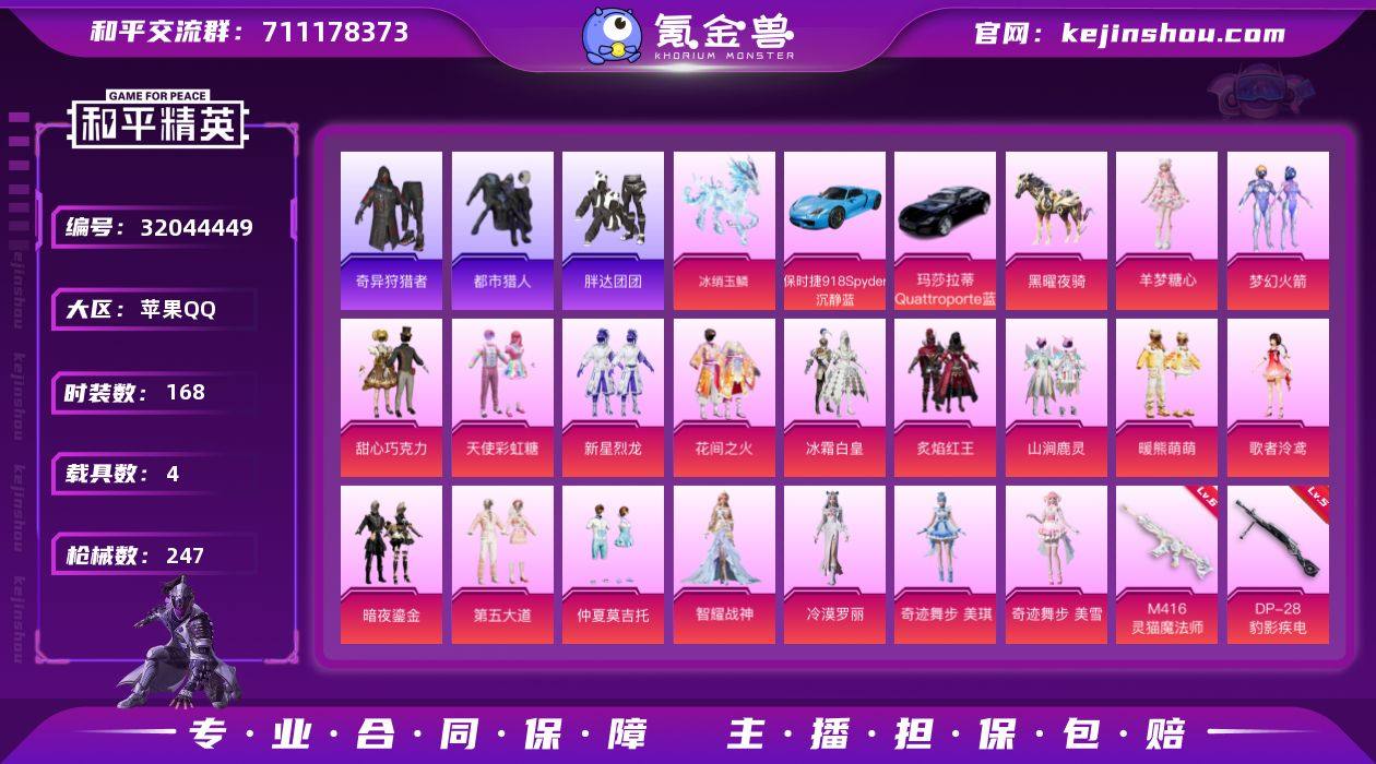 【妹妹号】1红19粉15特4载具 2级艾丽娅 都市猎人 暗影哥特 红熊茄茄 梦幻火箭 甜心巧克力 6级灵猫魔法师 3级暮色玫影 冰绡玉麟 黑曜夜骑 苹果 手Q-1神装-19粉装-15特效枪-4载具-10粉色飞行器-86739热力值-9王牌印记-168套装-247枪皮 【红色神装等级】:暮色玫影-艾丽娅(二级) 【红色角色神装】:暮色玫影-艾丽娅 【热门品类】:粉装-梦幻火箭,套装-浪漫天命,套装-都市猎人,套装-小丑鱼,套装-奇异狩猎者,套装-胖达团团,套装-PeRo战队服,套装-暗影哥特,套装-红熊茄茄 【粉色套装】:粉装-甜心巧克力,粉装-天使彩虹糖,粉装-梦幻火箭,粉装-新星烈龙,粉装-花间之火,粉装-冰霜白皇,粉装-炙焰红王,粉装-山涧鹿灵,粉装-暖熊萌萌,角色-歌者泠鸢,粉装-暗夜鎏金,粉装-第五大道,粉装-仲夏莫吉托,角色-智耀战神,角色-冷漠罗丽,角色-奇迹舞步 美琪,角色-奇迹舞步 美雪,角色-羊梦糖心,角色-月中灵 【粉色枪皮等级】:AKM-绿萝繁花(一级),AKM-暮色玫影(三级),SCAR-L-纯梦嫁纱(五级),M416-心之恋语(四级),M416-电玩时刻(五级),M416-灵猫魔法师(六级),ACE32-萌骑漫游(二级),ARX-无垠阁(五级),AKS-74U-无垠阁(三级),Mk14-福马献瑞(一级),AMR-智耀战神(五级),DP-28-豹影疾电(五级),PKM-萌骑夺宝(五级),MG-36-沧焰双生(五级),破片手榴弹-招财进宝(六级) 【粉色载具】:玛莎拉蒂Quattroporte(夜幕蓝),保时捷918 Spyder(沉静蓝),黑曜夜骑,冰绡玉鳞 【粉色枪皮】:AKM-绿萝繁花,AKM-暮色玫影,SCAR-L-纯梦嫁纱,M416-心之恋语,M416-电玩时刻,M416-灵猫魔法师,ACE32-萌骑漫游,ARX-无垠阁,AKS-74U-无垠阁,Mk14-福马献瑞,AMR-智耀战神,DP-28-豹影疾电,PKM-萌骑夺宝,MG-36-沧焰双生,破片手榴弹-招财进宝 【粉色飞行器】:炫彩糖果飞行器,太空嘟嘟飞行器,雀灵庇佑飞行器,终晖之...