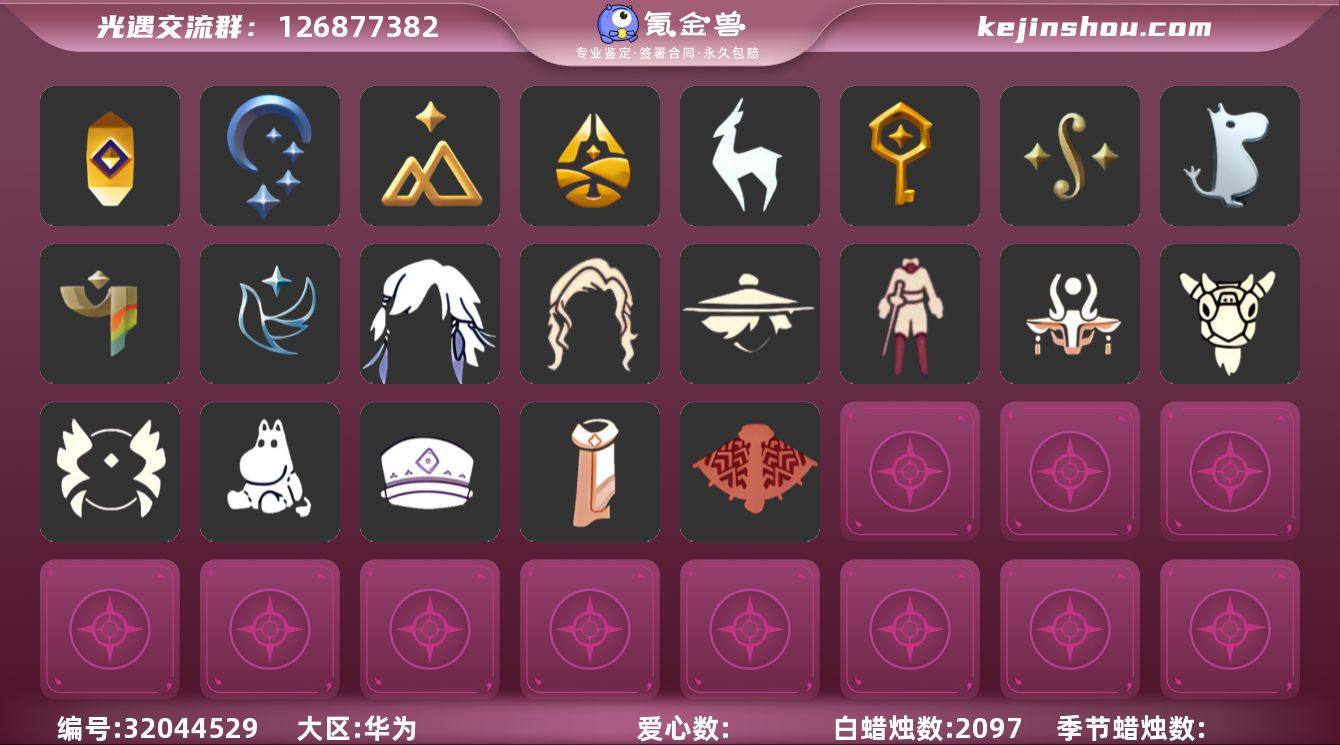 账号类型: 手机账号 季节已毕业: 小王子季,潜海季,表演季,破晓季,欧若拉季,追忆季,归巢季,九色鹿季,筑巢季,姆明季,青鸟季 完成地图: 晨岛,云野,雨林,霞谷,暮土,禁阁 珍稀物品: 白枭,透明蝶翼斗,玫瑰花,彩虹围巾 礼包: 蝙蝠套,巫师,围巾,小狐狸,九色鹿角,绊爱,鹿角,牛仔裤,白绒金,橘子,贝壳,红伞,兔子,星月头饰,四叶草,姆明饰品套装,青衫落拓礼包,线框斗篷礼包 裤子: 武士裤,搓澡巾,击剑裤,妮妮裙子,王子服,蓝绿裤,飞天裤,筑巢季·裤子 面具: 呼吸面具,黄眉企鹅面具 面饰: 红耳机,青鸟毕业面饰 项链: 围巾 发型: 归巢毕业发型,若笠,虚荣,单侧绑发,小王子发型,留辫蘑菇头,飞天盘发 头饰: 羽毛发饰,平顶帽 斗篷: 海洋斗,绿芽,遥鲲斗篷,燕尾斗篷,冥龙斗篷,青鸟毕业斗篷 配饰: 雨伞,筑巢季·小手办,高音钢琴,姆明抱枕,小红伞,玫瑰花,鲲灯 亮点: 【优质装备】:表演季,白枭(帝企鹅发),武士裤,小王子季(王子季),潜海季,破晓季,透明蝶翼斗,欧若拉季(欧若拉),归巢毕业发型(五塑彩羽发),羽毛发饰(多羽发饰),筑巢季·小手办(光之子试衣),高音钢琴(白色高脚钢琴),玫瑰花,追忆季,妮妮裙子(妮妮长裙),姆明抱枕,小红伞(姆明红伞)(姆明大伞),彩虹围巾(五塑彩带斗),归巢季,九色鹿(九色鹿季),王子服(小王子套装),蓝绿裤(高领舞服),飞天裤(柔缎花边连)(九色鹿丝带裤),围巾(肩带),筑巢季,红耳机,晨岛,云野,雨林,霞谷,墓土(暮土),禁阁,若笠(箬笠),姆明季,筑巢季·裤子(设计师长袍),呼吸面具(潜水面具),黄眉企鹅面具,单侧绑发(单边小辫),小王子发型,留辫蘑菇头,遥鲲斗篷(双翼遥鲲斗),燕尾斗篷,冥龙斗篷,鲲灯(追忆之书),飞天盘发(九色鹿丸子头),青鸟季,青鸟毕业面饰(青鸟面饰),青鸟毕业斗篷(青鸟斗篷),蝙蝠套(蝙蝠斗篷)(南瓜头),绊爱(绊爱斗篷)(绊爱礼包),线框斗篷礼包(周年线框斗篷),围巾(小王子斗篷)(小王子围巾),九色鹿角(神鹿祝福头饰)(神...