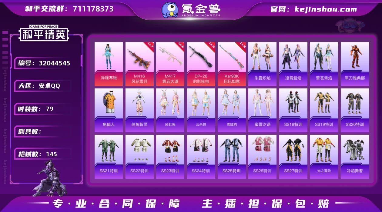 安卓 手Q-1粉装-7特效枪-0载具-1粉色飞行器-39781热力值-6王牌印记-79套装-145枪皮 【热门品类】:角色-军刀雅典娜,套装-龟仙人 【粉色套装】:角色-异瞳寒姬 【粉色枪皮等级】:M416-风花雪月(七级),ACE32-萌骑漫游(二级),AKS-74U-森灵之息(五级),Kar98K-巳巳如意(五级),Mk14-福马献瑞(五级),M417-第五大道(六级),DP-28-豹影疾电(五级) 【粉色枪皮】:M416-风花雪月,ACE32-萌骑漫游,AKS-74U-森灵之息,Kar98K-巳巳如意,Mk14-福马献瑞,M417-第五大道,DP-28-豹影疾电 【粉色飞行器】:炫彩糖果飞行器 【粉色降落伞】:旋转彩虹降落伞,未来歌姬降落伞,异瞳寒姬降落伞,炫彩糖果降落伞 【稀有套装】:套装-龟仙人,角色-俏兔智灵,套装-彩虹兔,套装-云朵鹅,套装-雪绒豹,套装-蜜露汐语,套装-朱霞炽焰,套装-凌霄紫焰,套装-擎苍青焰,套装-红釉青花 【稀有枪皮】:AKM-彩虹符号,AKM-灼热熔岩,AKM-龙的传人,SCAR-L-炫彩节奏,SCAR-L-玉兔迎春,SCAR-L-红色方程式,M416-糯团青竹,M416-绯红前夜,M416-蓝色火焰,GROZA-彩虹符号,GROZA-懵萌河马,AUG-天降萌叽,AUG-耀粉歌者,QBZ-洛神天依,M762-天降萌叽,M762-彩虹符号,M762-云朵鹅,Mk47-妙红点点,G36C-懵萌河马,AC-VAL-天降萌叽,蜜獾-天降萌叽,蜜獾-绯穹魔姬,ARX-凌霄紫焰,UZI-啾咪啾咪,UZI-红色方程式,UMP45-涂山之恋,UMP45-蓝色火焰,Vector-彩虹符号,Vector-生命誓言,汤姆逊-天降萌叽,汤姆逊-耀粉歌者,JS9-凌霄紫焰,P90-巳巳如意,Kar98K-影袭,Kar98K-红色方程式,M24-奇异狩猎者,SKS-糯团青竹,Mini14-涂山之恋,Mini14-耀粉歌者,SLR-彩虹符号,莫辛纳甘-懵萌河马,AMR-妙红点点,M417-惊鸿侠骨,M200-惊鸿侠骨,SVD-云朵鹅,SVD-冷漠罗丽,S686-彩虹符号,S686-生命誓言,S686-千金淑猫,S1897-春暖花开,S1897-炫彩...