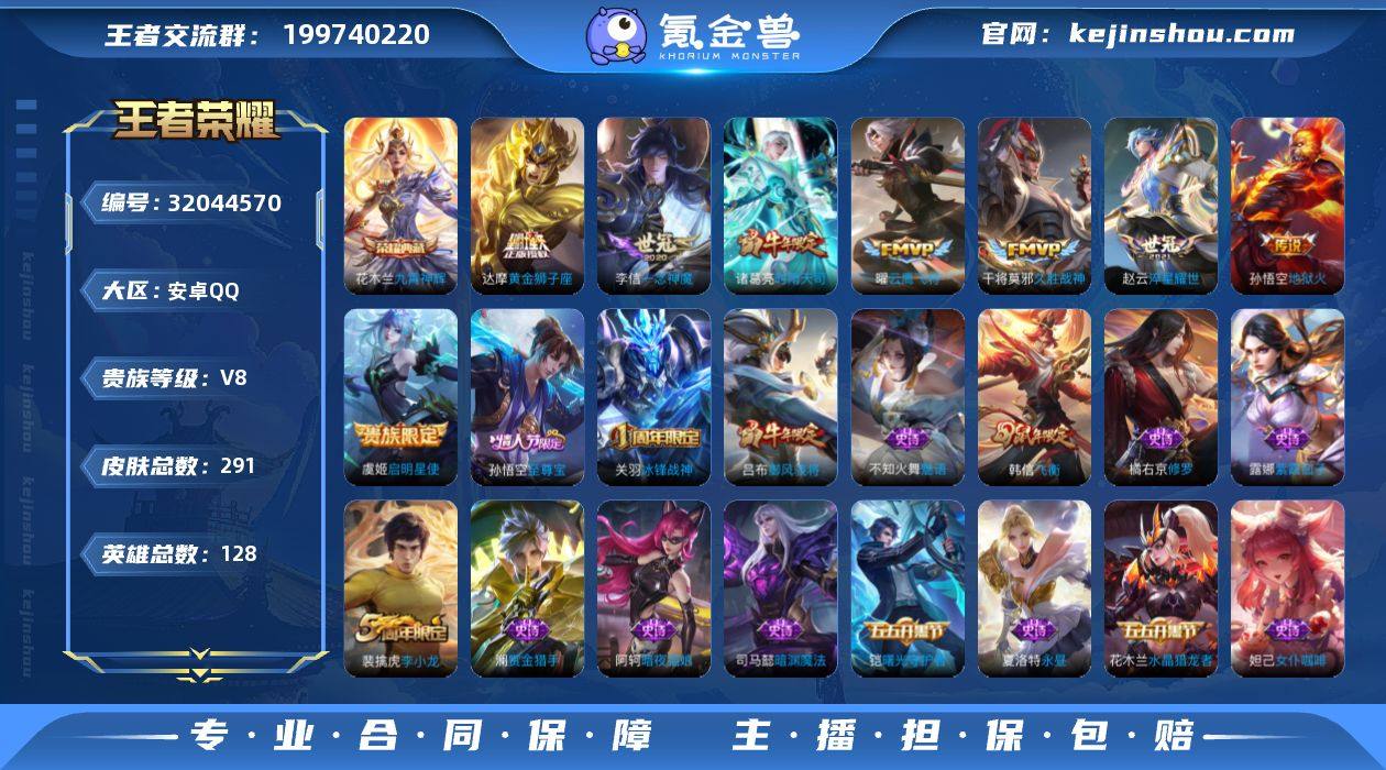 WZ4202937|手Q安卓 128英雄 291皮肤 贵族等级8 已兑换荣耀水晶数1 九霄神辉 启明星使 时雨天司 地狱火 神树通天 黄金狮子座 一念神魔 云鹰飞将 山海·炽霜斩 愿照·山河定 久胜战神 幻光神枪...