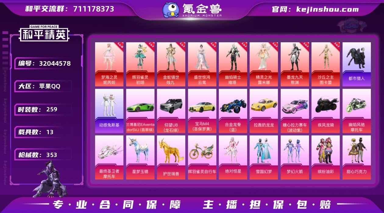 苹果 手Q-8神装-40粉装-36特效枪-13载具-30粉色飞行器-169231热力值-13王牌印记-259套装-353枪皮 【红色神装等级】:辉羽雀灵-初翊(一级),金蛇镇世-烛九(一级),盛世惊鸿-云鸾(一级),幽焰骑士-维塔(一级),精灵之光-露米娜(一级),梦海之灵-妮芮妲(四级),墨龙九天-敖渊(一级),沙丘之主-图卡盟(一级) 【红色角色神装】:辉羽雀灵-初翊,金蛇镇世-烛九,盛世惊鸿-云鸾,幽焰骑士-维塔,精灵之光-露米娜,梦海之灵-妮芮妲,墨龙九天-敖渊,沙丘之主-图卡盟 【热门品类】:粉装-雪国幻梦,粉装-梦幻火箭,粉装-缤纷油彩,套装-浪漫天命,套装-都市猎人,套装-小丑鱼,角色-军刀雅典娜,套装-动感兔斯基人偶服,套装-龟仙人,套装-暗影哥特,角色-8号机,角色-Mark.06,角色-六号稻草人,套装-红熊茄茄 【粉色套装】:角色-绝对恒星,粉装-甜心巧克力,粉装-宝贝奶油派,粉装-天使彩虹糖,粉装-雪国幻梦,粉装-梦幻火箭,粉装-缤纷油彩,粉装-炙焰红王,粉装-垂柳戏鸭,粉装-旋转彩虹,粉装-第五大道,角色-阿尔茜,粉装-傲傲奶龙,角色-圣堂之誓,角色-小叽联名款,粉装-蜜语绒猫,角色-烟云彩露,角色-严莉莉,角色-小蓝,角色-美雪,角色-美琪,角色-电磁星,角色-光极星,粉装-冠军兔兔,套装-创世·救赎,角色-星梦奇缘,角色-守护天翼,角色-初号机 觉醒Ver.,角色-金域紫灵,粉装-未来领航者,角色-千金淑猫,角色-月影灵韵,粉装-桃粉嫣然,粉装-雪月幻音,角色-天马座 星矢,粉装-星穹咏叹调,粉装-幻彩电音,角色-狂魅哈莉,角色-奇迹舞步 美雪,角色-罪夜之冕 【粉色枪皮等级】:AKM-绿萝繁花(五级),AKM-幽焰骑士(六级),SCAR-L-锦绣绵绵(五级),M416-暖熊萌萌(五级),M416-超新星(六级),M416-墨龙九天(三级),GROZA-旋转彩虹(一级),GROZA-精灵之光(三级),AUG-星梦奇缘(三级),Vector-最终圣卫者(三...