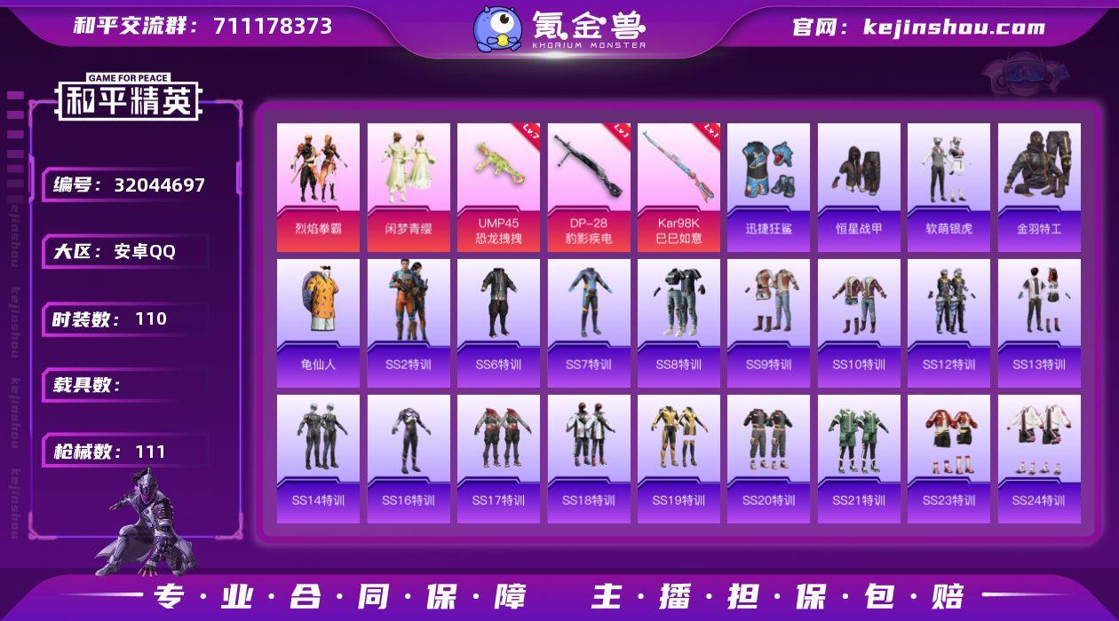安卓 手Q-2粉装-3特效枪-0载具-35277热力值-7印记-110套装-111枪皮 【特效枪等级】:UMP45-恐龙拽拽(七级),Kar98K-巳巳如意(一级),DP-28-豹影疾电(一级) 【优质套装】:粉装-烈焰拳霸,粉装-闲梦青缨 【稀有套装】:套装-龟仙人 【优质武器皮肤】:UMP45-恐龙拽拽,Kar98K-巳巳如意,DP-28-豹影疾电 【稀有武器皮肤】:AKM-冰凉西瓜,AKM-四圣焕新,AKM-夜灯,AKM-奇异狩猎者,AKM-彩虹符号,AKM-灼热熔岩,AKM-生命誓言,AKM-破晓战魂,AKM-缤纷海域,AKM-萌趣颜团子,AKM-虎虎生威,AKM-霓虹街区,AKM-龙的传人,M16A4-幻世战舞者,M16A4-红色方程式,SCAR-L-炫彩节奏,SCAR-L-红色方程式,SCAR-L-雷霆特警,M416-夜灯,M416-糯团青竹,M416-红色方程式,M416-蓝色火焰,GROZA-春暖花开,AUG-天降萌叽,AUG-耀粉歌者,QBZ-彩虹符号,M762-牛气冲天,M762-瑞龙福将,蜜獾-天降萌叽,UZI-啾咪啾咪,UZI-天降萌叽,UZI-影袭,UZI-炫彩节奏,UZI-烈焰拳霸,UZI-生命誓言,UMP45-夜灯,UMP45-生命誓言,UMP45-电音之王,UMP45-蓝色火焰,Vector-夜灯,Vector-彩虹符号,Vector-暗夜玫瑰,Vector-生命誓言,汤姆逊-幻影战神,野牛-夜灯,Kar98K-彩虹符号,Kar98K-红色方程式,Kar98K-蓝莓炮弹,M24-影袭,SKS-夜灯,SKS-玉龙,Mini14-炫彩节奏,Mini14-耀粉歌者,Win94-瑞龙福将,SLR-四圣焕新,S686-生命誓言,S686-红色方程式,S1897-百万伏特,S1897-碧影闪光,S12K-玩趣呆呆,S12K-瑞龙福将,S12K-香水柠檬,S12K-幻影战神,M249-工程核心,M249-彩虹符号,DP-28-彩虹符号,DP-28-橘柚倾心,DP-28-清新柠檬,MG3-瑞龙福将,蝎式手枪-欢乐香蕉,大砍刀-鬼刀 【热门品类】:套装-金羽特工 【其他套装】:套装-SS2特训,套装-SS6特训,套装-SS7特训,套装-SS8特训,套装-SS9特训,套装-SS10特训,套装-SS12特训,套...