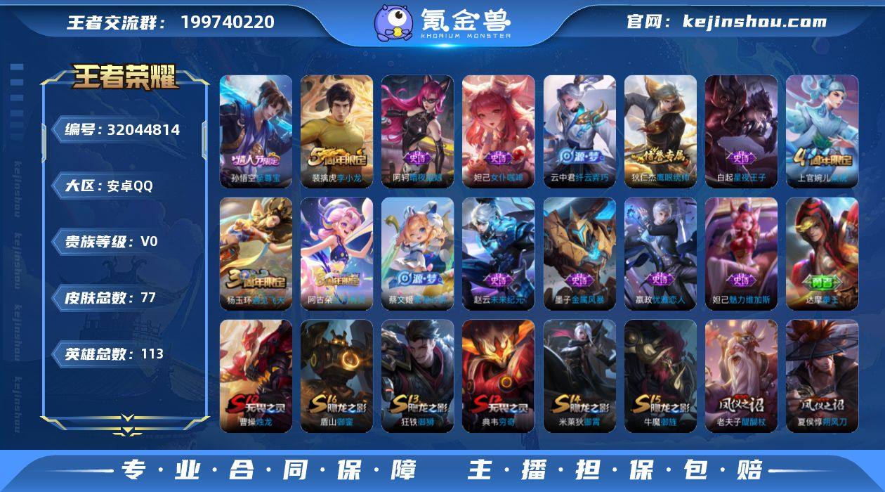 贵族等级:V0 典藏皮肤数:0 珍品无双皮肤数:0 无双皮肤数:0 珍品传说皮肤数:0 传说皮肤数:0 史诗皮肤数:15 皮肤数:77 英雄数:113 段位:白银 卖家说:看上就买,不议价,贵点有保障