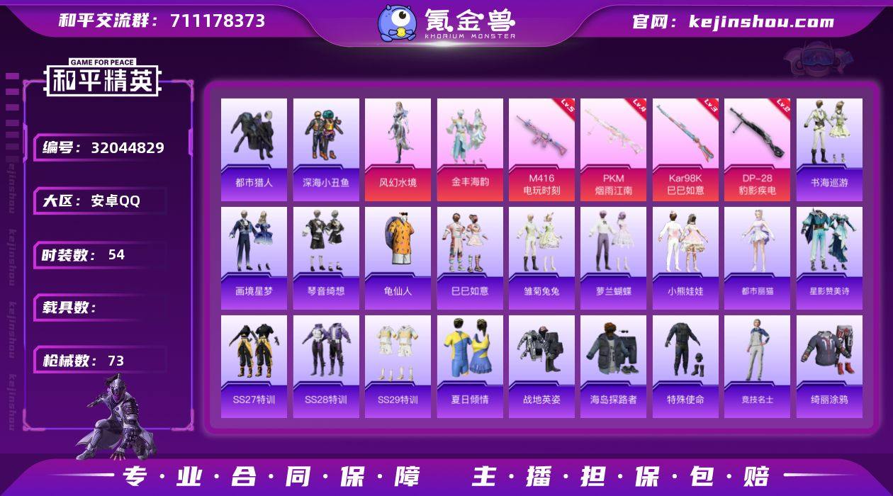 安卓 手Q-3粉装-4特效枪-0载具-1粉色飞行器-22588热力值-1王牌印记-54套装-73枪皮 【热门品类】:套装-都市猎人,套装-深海小丑鱼,套装-龟仙人 【粉色套装】:角色-风幻水境,粉装-金丰海韵,角色-罪夜之冕 【粉色枪皮等级】:M416-电玩时刻(五级),Kar98K-巳巳如意(三级),DP-28-豹影疾电(二级),PKM-江南烟雨(四级) 【粉色枪皮】:M416-电玩时刻,Kar98K-巳巳如意,DP-28-豹影疾电,PKM-江南烟雨 【粉色飞行器】:香车宝马飞行器 【粉色降落伞】:星之彼岸降落伞,鎏金朋克降落伞,江南烟雨降落伞,精灵梦叶罗丽降落伞,鬼刀降落伞,罪夜之冕降落伞 【稀有套装】:套装-龟仙人,套装-巳巳如意,套装-雏菊兔兔,套装-萝兰蝴蝶,套装-小熊娃娃,角色-都市丽猫,套装-星影赞美诗,套装-书海巡游,套装-画境星梦,套装-琴音绮想,角色-月烬之祷 【稀有枪皮】:AKM-星之彼岸,AKM-江南烟雨,M416-蓝色火焰,QBZ-洛神天依,蜜獾-天降萌叽,ACE32-画境星梦,UZI-天降萌叽,UZI-红色方程式,UMP45-夜灯,Vector-焰鹰斗篷,汤姆逊-幻影战神,MP5K-画境星梦,M24-影袭,AWM-焰鹰斗篷,AWM-鎏金朋克,SKS-金玉无双,VSS-星之彼岸,M1加兰德-画境星梦,S686-蜜语绒猫,S686-生命誓言,S12K-幻影战神,DBS-焰鹰斗篷,AA12-G-画境星梦,M249-星之彼岸,DP-28-焰鹰斗篷,PKM-蜜语绒猫,TMP-9-江南烟雨,战术弩-江南烟雨,平底锅-绝色倾城,平底锅-画境星梦 【其他套装】:套装-SS27特训,套装-SS28特训,套装-SS29特训,套装-夏日倾情,套装-战地英姿,套装-海岛探路者,套装-特殊使命,套装-竞技名士,套装-绮丽涂鸦,套装-酒红色名流,套装-长空猛禽,套装-青年教官,套装-魅力单车,套装-龟仙人,套装-冰冻风暴,套装-深海小丑鱼,套装-快乐星愿,套装-星梦畅游,套装-电音精灵,套装-焰鹰斗篷,套装-幽夜迷踪,套装-幻羽潜...