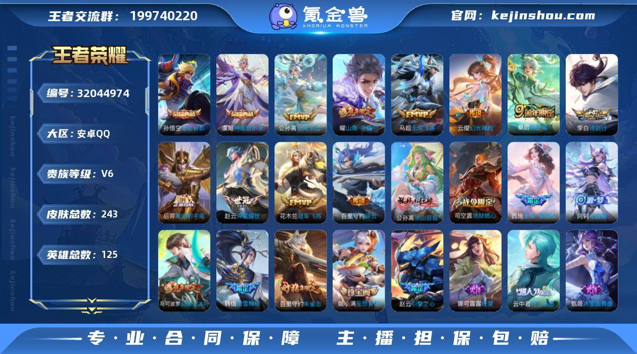 【云诺千山诗剑行 243皮10传说】:安卓Q-V7-至尊星耀IV段位-125英雄-243皮肤-2典藏-0珍品无双-0无双-0珍品传说-10传说-71史诗 【荣耀典藏】:孙悟空全息碎影,虞姬神鉴启示录 【传说皮肤】:公孙离云诺千山,云缨幻光神枪,桑启鸣野蒿,曜山海苍雷引,李白诗剑行,百里守约碎云,马超无双飞将,赵云淬星耀世,花木兰冠军飞将,后羿黄金射手座 【限定皮肤】:蒙犽顽岩魄,姜子牙天穹之誓,狄仁杰阴阳师,赵云皇家上将,赵云引擎之心,赵云百木心枪,阿轲迷踪丽影,钟无艳超时空战士,元歌无心,甄姬游园惊梦,甄姬落雪兰心,马可波罗山海玄木吟,狄仁杰魔术师,狄仁杰万华元夜,达摩沙漠行僧,项羽海滩派对,老夫子醍醐杖,程咬金演武夺筹,韩信傲雪梅枪,兰陵王金庭之子,李元芳云中旅人,钟馗驱傩正仪,干将莫邪胡桃夹子,雅典娜黎明之约,鬼谷子原初探秘者,鬼谷子五谷丰年,苏烈千军破阵,百里守约朱雀志,弈星混沌棋,沈梦溪大漠名商,明世隐疑决卦,裴擒虎李小龙,裴擒虎擒涛扼浪,云中君时之祈愿,嫦娥暖冬兔眠,曜山海苍雷引,西施玲珑珍味,西施至美乘鲤谣,鲁班大师探海日志,镜匿光追影者,桑启海盐诗旅,暃星界游侠,戈娅驭风魔法,艾琳流音漫舞,司空震地狱燃心,阿古朵江河有灵,张良古海寻踪,蒙犽百解令,妲己灵卜魔法,鬼谷子天穹祈灯,姬小满妄想食味,沈梦溪龙舞盛年,鲁班七号蔬乡物语,李元芳蔬乡物语,刘邦剑破天穹,程咬金群星魔术团,镜青焰无极,项羽苍威无极,周瑜熔金海岸 【年限皮肤】:百里守约朱雀志,马可波罗山海玄木吟,曜山海苍雷引 【赛季限定】:狄仁杰万华元夜,达摩沙漠行僧,老夫子醍醐杖,程咬金演武夺筹,兰陵王金庭之子,张良古海寻踪,李元芳云中旅人,钟馗驱傩正仪,雅典娜黎明之约,鬼谷子原初探秘者,苏烈千军破阵,弈星混沌棋,沈梦溪大漠名商,明世隐疑决卦,裴擒...