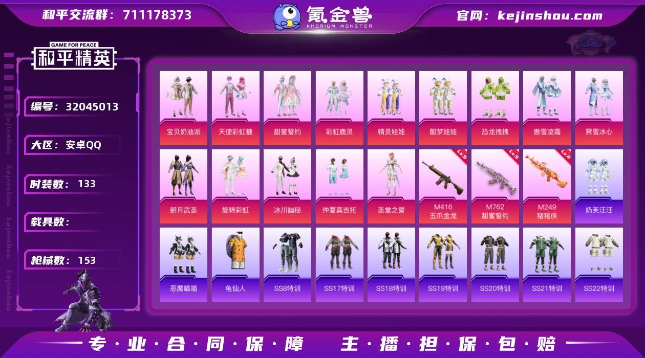 安卓 手Q-14粉装-3特效枪-0载具-50612热力值-4印记-133套装-153枪皮 【特效枪等级】:M416-五爪金龙(五级),M762-甜蜜誓约(五级),M249-猪猪侠(四级) 【优质套装】:粉装-宝贝奶油派,粉装-天使彩虹糖,粉装-甜蜜誓约,粉装-彩虹鹿灵,粉装-精灵娃娃,粉装-酣梦娃娃,粉装-恐龙拽拽,粉装-傲雪凌霜,粉装-霁雪冰心,粉装-朗月武圣,粉装-旋转彩虹,粉装-冰川幽秘,粉装-仲夏莫吉托,角色-圣堂之誓 【稀有套装】:套装-龟仙人 【优质武器皮肤】:M416-五爪金龙,M762-甜蜜誓约,M249-猪猪侠 【稀有武器皮肤】:AKM-夜灯,AKM-彩虹符号,AKM-破晓战魂,AKM-虎虎生威,AKM-霓虹街区,AKM-龙的传人,M16A4-幻世战舞者,M16A4-甜心亚梦,M16A4-红色方程式,M16A4-蓝色火焰,SCAR-L-炫彩节奏,SCAR-L-玉兔迎春,SCAR-L-甜蜜誓约,SCAR-L-红色方程式,M416-夜灯,M416-月影鸳鸯,M416-红色方程式,M416-蓝色火焰,GROZA-异彩先驱,GROZA-恐龙拽拽,GROZA-懵萌河马,GROZA-甜蜜草莓,GROZA-田园牧歌,GROZA-蓝莓炮弹,AUG-天降萌叽,AUG-耀粉歌者,QBZ-彩虹符号,QBZ-未来歌姬,QBZ-飞驰魅影,M762-瑞龙福将,M762-甜心宝贝,M762-绒雪飘舞,Mk47-妙红点点,G36C-懵萌河马,G36C-青丘仙客,AC-VAL-天降萌叽,AC-VAL-彩虹甜喵,AC-VAL-快闪甜心,AC-VAL-甜心亚梦,蜜獾-千面幻镜,蜜獾-垂柳戏鸭,蜜獾-天降萌叽,蜜獾-娇憨猪猪,UZI-啾咪啾咪,UZI-墨染幽兰,UZI-娇憨猪猪,UZI-红色方程式,UMP45-夜灯,UMP45-涂山之恋,UMP45-猪猪侠,UMP45-生命誓言,UMP45-蓝色火焰,UMP45-诡娃娃,Vector-彩虹符号,Vector-生命誓言,Vector-田园牧歌,汤姆逊-异彩先驱,汤姆逊-暗夜鎏金,汤姆逊-炫彩节奏,野牛-青春冒险家,MP5K-异彩先驱,MP5K-甜蜜誓约,P90-快闪甜心,P90-飞驰魅影,Kar98K-炫彩节奏,Kar98K-王子的夏天,Kar98K-...