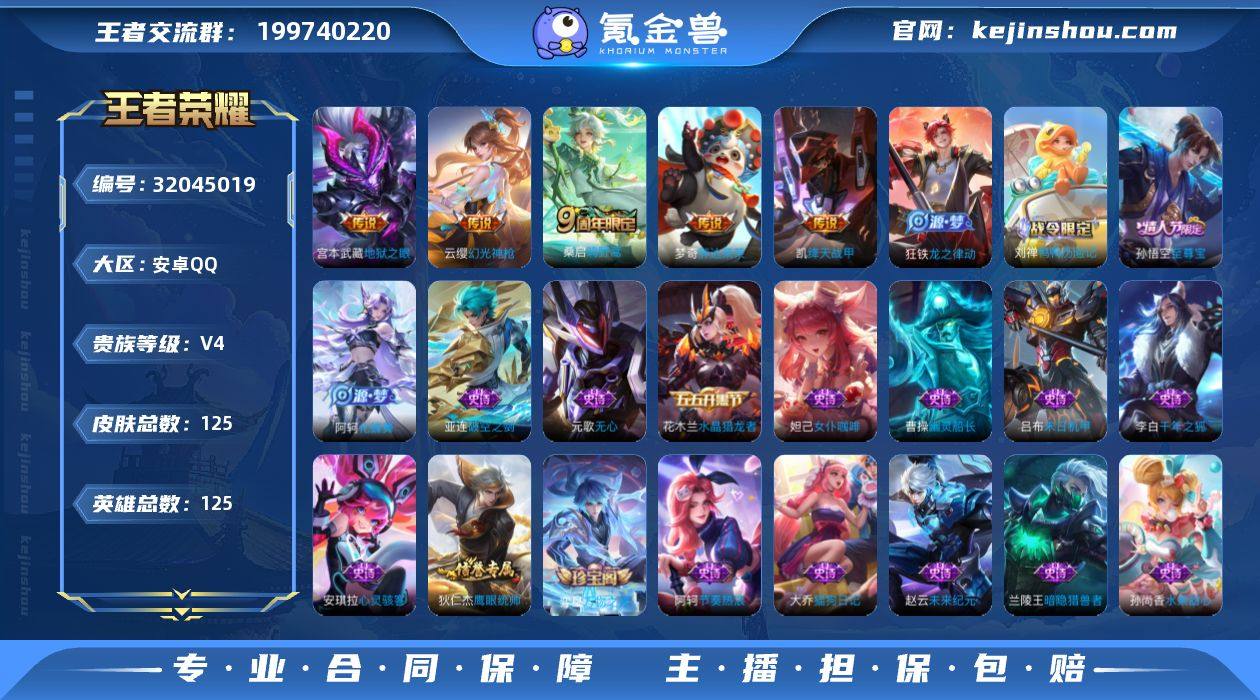 王者营地:1650671501 实名情况:不可二次实名 是否支持人脸包赔:是 有无防沉迷:无防沉迷 是否可排位:是 VIP等级:V4 段位:最强王者 水晶数量:0 英雄数量:125 皮肤数量:125 典藏数量:0 传说数量:6 史诗数量:37 召唤师等级:30 五级铭文:6 珍品无双数量:0 无双数量:0 珍品传说数量:0 英雄全皮:孙权全皮,敖隐全皮,空空儿全皮,影全皮 传说皮肤: