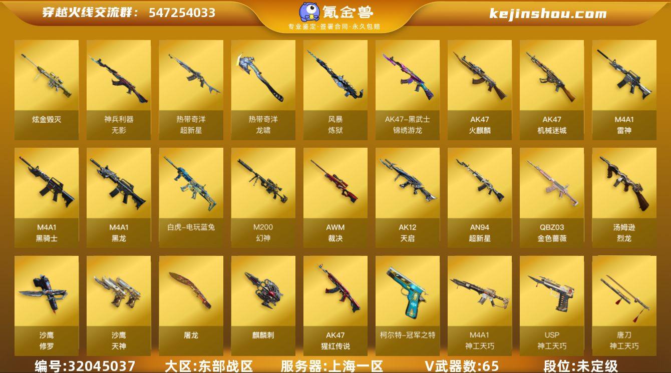 上海一区-67V-12王者-2炫金 【热门武器】:QBZ03-金色蔷薇,M200-幻神,死亡之眼,白虎-电玩蓝兔,柯尔特-冠军之特*2,M4A1-黑骑士,汤姆逊-烈龙*6,加特林-炼狱,斯泰尔-蝴蝶,沙鹰-修罗,Knife-冠军之刃,黄金猫猫手套-白鲨 【王者炫金武器】:王者玉锋,炫金武士,炫金毁灭,王者之魄高爆手雷*2,王者之魄闪光弹*3,王者之魄烟雾弹 【音效卡】:M4A1-黑骑士音效卡,AWM-裁决音效卡,枪娘语音包-阿敏,Barrett-碧霄极光音效卡 【皮肤】:幻神-动感闪耀 皮肤,QBZ03-冠军之薇,金色蔷薇-枪娘阿敏 皮肤,裁决-叶芒苍灵 皮肤,雷神-暗月,雷神-虎将,雷神-冠军之魄,火麒麟-雷神,火麒麟-冠军之心,火麒麟-心动糖果,毁灭-风暴,黑龙-暗月,黑骑士-冠军之势,黑骑士-地狱火,战神-粉色甜心皮肤*4,战神-紫绶金章皮肤,战神-流金岁月皮肤*2,AK47-B-常胜将军-孙权*2,炼狱-月 皮肤,麒麟刺-萌杀皮肤,麒麟刺-月皮肤 【角色】:枪娘樱,兰-巾帼英雄,王者-瞳-闭月羞花,王者葵-惊若翩鸿,王者春,奇洋探员,乔伊教练,修道士,初恋灵狐,风暴女,虎妞,嘉年华灵狐,娟娟,猎狐者-追月,灵狐-花神,灵狐者-X,灵狐者-黄金海岸,灵狐者-七夕宝贝,龙儿-小淘气,麻雀,曼陀罗-礼服,萌儿,潘多拉-X,潘多拉-甜心教官,青霞仙子,斯沃特-X,兔囡囡,新娜塔莎,雪莉杨-摸金校尉,夜玫瑰-幻能朋克,影武者-X 【人偶武器】:天龙-曼陀罗,火麒麟-灵狐,斯泰尔-蝴蝶,M37-葵,COP-旗袍,迷你深渊冰龙*3,迷你生化手雷,生化手雷-机甲核心,迷你超能女侍 【暴走生化】:死亡之眼,超级对讲机 【挑战大师】:冰龙粉碎者-白马银枪*3,激光毁灭者III-白马银枪,神圣爆裂者-末日III 【英雄级武器】:AK47-火麒麟,M4A1-黑龙,M4A1-雷神,M4A1-黑骑士,AK12-天启,AN94-超新星,AK47-机械迷城,M4A1-神工天巧,无影-神兵利器,黑武...