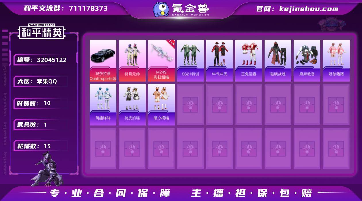 【1粉1特1载具 玛莎拉蒂 彩虹喵喵】苹果 手Q-1粉装-1特效枪-1载具-0粉色飞行器-6893热力值-1王牌印记-10套装-15枪皮 【粉色载具】:玛莎拉蒂Quattroporte(夜幕蓝) 【粉色套装】:粉装-狩月元帅 【粉色枪皮等级】:M249-彩虹甜喵(四级) 【粉色枪皮】:M249-彩虹甜喵 【粉色降落伞】:彩虹甜喵降落伞 【稀有枪皮】:SCAR-L-玉兔迎春,M762-彩虹甜喵,AC-VAL-天降萌叽,AC-VAL-彩虹甜喵,蜜獾-娇憨猪猪,UZI-娇憨猪猪,SLR-娇憨猪猪,S12K-娇憨猪猪,DBS-彩虹甜喵,SPAS-12-太空嘟嘟 【其他套装】:套装-SS21特训,套装-牛气冲天,套装-玉兔迎春,套装-破晓战魂,套装-麻辣教官,套装-娇憨猪猪,套装-萌趣咩咩,套装-俏皮奶喵,套装-暖心橘喵 【营地ID】:936199329