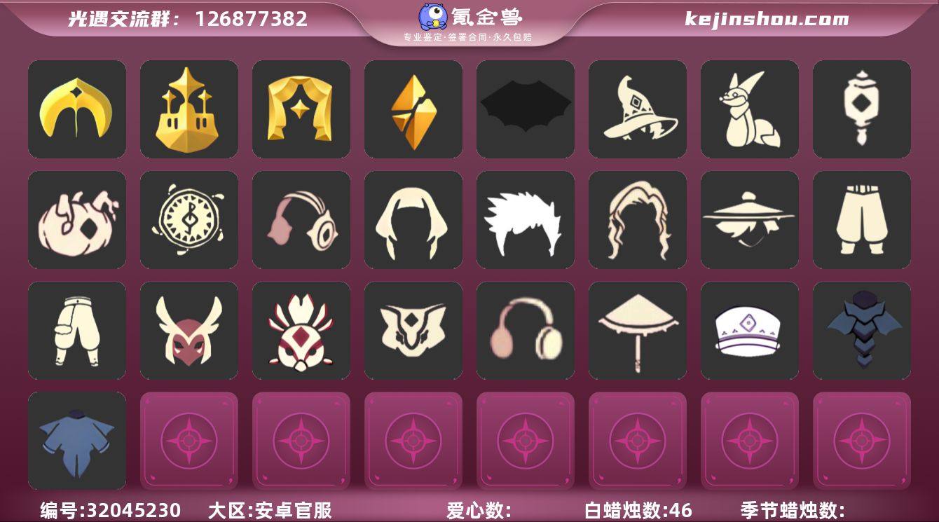 13季10翼巫师帽蝙蝠斗青衫落拓欧若拉之翼透明蝶翼武士裤详情看图,价格可刀 资源:蜡烛 340爱心 23 红烛 70 翼10 已毕业地图:全图毕业 毕业季节: 欧若拉季 追忆季 夜行季 归巢季 九色鹿季 筑巢季 二重奏季 姆明季 彩染季 青鸟季 双星季 半拾光季 半迁徙季 毕业季节物品:留辨蘑菇头 高领舞服 透明蝶翼斗 肩带 追忆之书 棕熊面具 绒毛斗篷 五塑彩羽发 五塑彩带斗 九色鹿丸子头 九色鹿丝带裤 九色鹿飞天斗篷 设计师长袍 光之子试衣 合奏挂画 蓝色燕尾服 白色高脚钢琴 姆明抱枕 姆明大伞 姆明长裙 彩染围巾斗篷 辉光羚羊面具 青鸟面饰 青鸟斗篷 蓝色星星光环 暮星斗篷 稀有礼包:巫树犄角 彩虹耳机 星月头冠 玉兔头饰 冥龙南瓜 巫师帽 青衫落拓发型 蝙蝠斗 南瓜头 欧若拉之翼 热门裤子:背带裤 鳐鲲长裙 绑带舞服 奔月长袍 妮妮长裙 海洋武士裤 搓澡巾 紧身连体衣 武士裤 女仆围裙 美工衣 红色流珠裙 探险燕尾服 米色西装裤 热门面具:矮人面具 黄鼠狼面具 红兔面具 棕熊面具 盲僧眼罩 向导面具 青鸟面具 龙头 玫瑰花面具 玫瑰面具 黑脸 粽叶面具 鸟羽面具 热门发型:海草头 爆炸头 大胡子 小飞象 雨妈 卡卡 平菇 龙骨 指甲盖 公主头 粗辫 书虫 正太 明制帽 郡主头 斗笠 绿丝带 虚荣 圆环发辫 李逍遥发型 彩色脏辫 彩羽发型 兔子头 樱花头 马蹄莲发型 鳐鲲发型 猫猫头 女巫发型 光头 圣诞帽 南瓜头 巫师帽 青衫落拓发型 热门头饰:双星季头饰 花环 珊瑚发饰 蓝色音乐会 探险耳机 巫树犄角 彩虹耳机 星月头冠 玉兔头饰 热门斗篷:五角星斗篷 白金斗篷 展翼圆环斗篷 透明蝶翼 小浣熊斗篷 毛绒斗篷 布条斗篷 布丁斗篷 彩霞斗篷 国风斗篷 灰...
