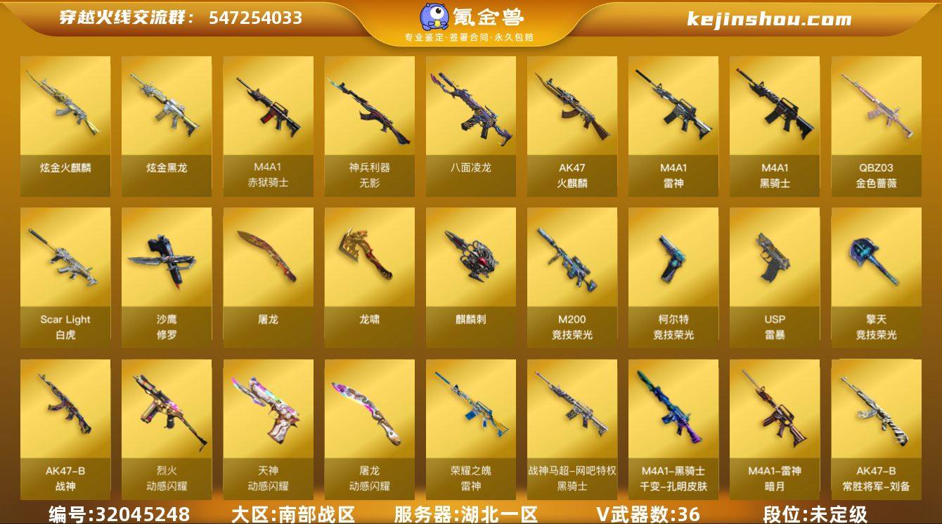 湖北一区-38V-2王者-2炫金 【热门武器】:QBZ03-金色蔷薇,Scar Light-白虎,M200-竞技荣光,八面凌龙,M4A1-黑骑士,USP-雷暴,沙鹰-修罗 【王者炫金武器】:炫金火麒麟,炫金黑龙 【音效卡】:M4A1-黑骑士音效卡 【皮肤】:雷神-暗月,雷神-荣耀之魄,火麒麟-雷神,火麒麟-平天大圣,毁灭-黑大圣皮肤,M4A1-千变-孔明皮肤,黑骑士-战神马超,黑骑士-破浪10年皮肤,战神-紫绶金章皮肤,AK47-B-常胜将军-刘备*3 【角色】:雨棠,电竞教官-云悠悠,乔伊教练,北极狐-X,初恋灵狐,电竞少女,芳心审判者,虎妞,嘉年华灵狐,灵狐者-黄金海岸,斯沃特-X,蜀雪,兔囡囡 【人偶武器】:AWM-灵狐-15周年嘉年华,迷你深渊冰龙,迷你牛魔王,迷你牛牛,迷你生化手雷,生化手雷-机甲核心,迷你超能女侍 【挑战大师】:神圣爆裂者-末日III 【英雄级武器】:AK47-火麒麟,M4A1-雷神,M4A1-黑骑士,Scar Light-白虎,无影-神兵利器,八面凌龙,QBZ03-金色蔷薇,烈火-动感闪耀,AK47-B-战神*2,王者白虎-觉醒版,M200-竞技荣光,王者星神-觉醒版,沙鹰-修罗,USP-雷暴,柯尔特-竞技荣光,天神-动感闪耀,屠龙,龙啸,麒麟刺*3,擎天-竞技荣光,屠龙-动感闪耀,高爆手雷-竞技荣光*2,高爆手雷-神工天巧,手雷-动感闪耀,闪光弹-竞技荣光*2,闪光弹-神工天巧,烟雾弹-竞技荣光*2,烟雾弹-神工天巧,M4A1-赤狱骑士 【道具】:BS战队炫彩背包,云山科技背包,全能枪王背包,炫彩背包-诺拉,超级背包,女皇终结者-魔龙之吻,救世主-黑桃战神,绿色巨人,灵魂忍者,变异宝贝,迷雾幽灵,夺命之镰,防化服*3,金色流光-枪王排位*2,星辰流光-枪王排位,枪王排位28赛季金色流光,语音特效-机器人,电玩兔兔表情,动感闪耀表情,防弹头盔*5,防弹衣*5,C4工具钳*4,手雷包*4 【特殊枪械】:1白虎,1黑骑士