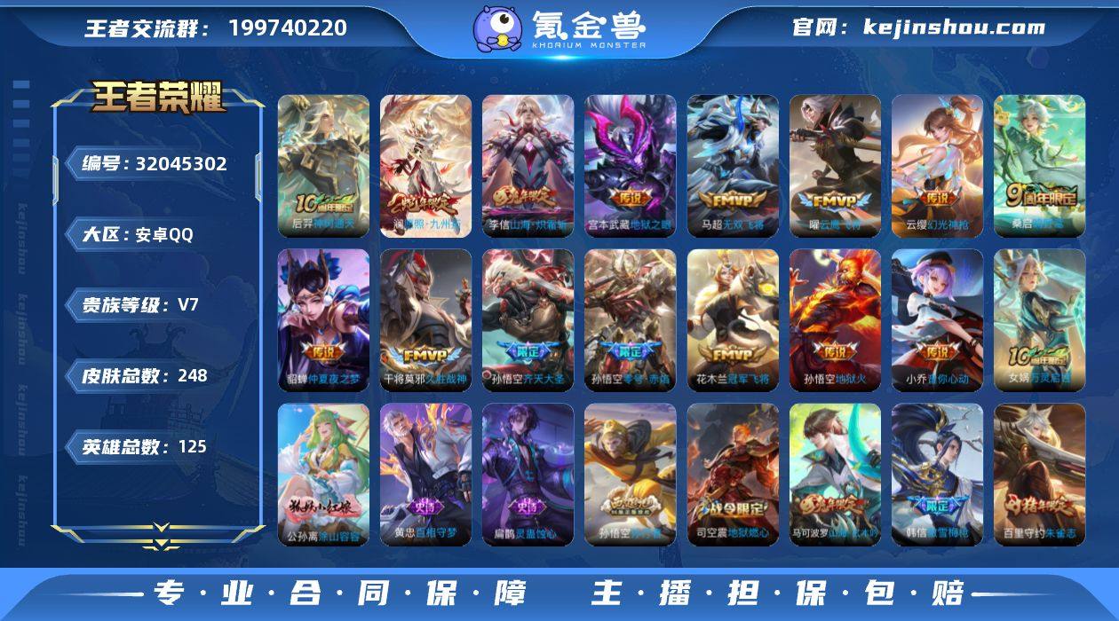 【248皮15传说 愿照九州拓 齐天大圣 山海炽霜斩 无双飞将】安卓Q-V7-最强王者段位-125英雄-248皮肤-0典藏-0珍品无双-0无双-0珍品传说-15传说-70史诗 【传说皮肤】:后羿神树通天,澜愿照九州拓,云缨幻光神枪,桑启鸣野蒿,孙悟空齐天大圣,李信山海炽霜斩,马超无双飞将,小乔音你心动,孙悟空零号赤焰,曜云鹰飞将,干将莫邪久胜战神,花木兰冠军飞将,貂蝉仲夏夜之梦,宫本武藏地狱之眼,孙悟空地狱火 【限定皮肤】:大乔绒语心约,姜子牙天穹之誓,杨戬破阵退雄兵,狄仁杰阴阳师,赵云皇家上将,孙尚香蔷薇恋人,庄周高山流水,扁鹊奇幻香踪,元歌无心,甄姬游园惊梦,马可波罗山海玄木吟,狄仁杰魔术师,达摩沙漠行僧,项羽海滩派对,程咬金演武夺筹,韩信傲雪梅枪,兰陵王金庭之子,孙悟空零号赤焰,孙悟空孙行者,孙悟空齐天大圣,后羿如梦令,后羿圣弓游侠,李元芳银河之约,李元芳云中旅人,钟馗驱傩正仪,杨戬潮玩骑兵,干将莫邪真爱魔法,鬼谷子五谷丰年,苏烈千军破阵,百里守约朱雀志,沈梦溪大漠名商,裴擒虎李小龙,裴擒虎擒涛扼浪,云中君纤云弄巧,李信山海炽霜斩,嫦娥拒霜思,西施玲珑珍味,鲁班大师探海日志,桑启海盐诗旅,戈娅驭风魔法,艾琳女武神,艾琳流音漫舞,司空震地狱燃心,阿古朵江河有灵,张良古海寻踪,蒙犽百解令,鬼谷子天穹祈灯,沈梦溪龙舞盛年,刘邦剑破天穹,上官婉儿群星魔术团,镜青焰无极,项羽苍威无极,刘备异域游侠,周瑜熔金海岸 【年限皮肤】:百里守约朱雀志,马可波罗山海玄木吟,李信山海炽霜斩 【赛季限定】:达摩沙漠行僧,程咬金演武夺筹,兰陵王金庭之子,张良古海寻踪,李元芳云中旅人,钟馗驱傩正仪,苏烈千军破阵,沈梦溪大漠名商,裴擒虎擒涛扼浪,鲁班大师探海日志,桑启海盐诗旅,鬼谷子天穹祈灯,刘邦剑破天穹,姜子牙天穹之誓 【战令限定】:扁鹊...