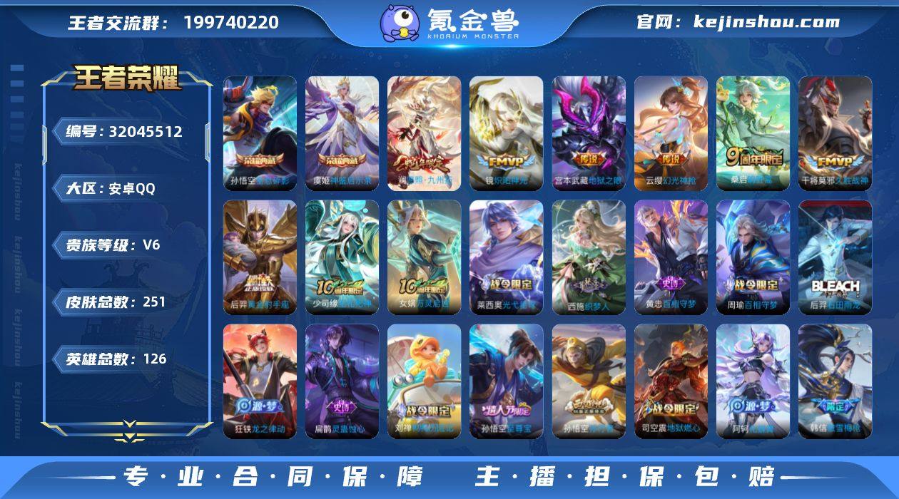 【251皮2典藏7传说 至尊宝 神鉴启示录 全息碎影 幽冥之眼 九州拓 傲雪梅枪】安卓Q-V6-最强王者段位-126英雄-251皮肤-2典藏皮肤-7传说-68史诗 【英雄全皮】:空空儿全皮,影全皮 【荣耀典藏】:孙悟空全息碎影,虞姬神鉴启示录 【传说皮肤】:澜愿照九州拓,云缨幻光神枪,桑启鸣野蒿,镜炽阳神光,干将莫邪久胜战神,后羿黄金射手座,宫本武藏地狱之眼 【限定皮肤】:虞姬夏日便利店,姜子牙天穹之誓,杨戬破阵退雄兵,狄仁杰阴阳师,赵云皇家上将,孙尚香蔷薇恋人,扁鹊奇幻香踪,元歌云间偶戏,狄仁杰魔术师,达摩沙漠行僧,项羽海滩派对,韩信傲雪梅枪,兰陵王金庭之子,孙悟空美猴王,孙悟空至尊宝,孙悟空孙行者,李元芳云中旅人,钟馗驱傩正仪,杨戬潮玩骑兵,雅典娜黎明之约,鬼谷子五谷丰年,沈梦溪大漠名商,裴擒虎李小龙,裴擒虎擒涛扼浪,米莱狄胡桃异想国,西施玲珑珍味,鲁班大师探海日志,桑启海盐诗旅,戈娅驭风魔法,艾琳流音漫舞,司空震地狱燃心,阿古朵江河有灵,张良古海寻踪,蒙犽百解令,高渐离燃音魔法,妲己灵卜魔法,鬼谷子天穹祈灯,姬小满妄想食味,沈梦溪龙舞盛年,鲁班七号蔬乡物语,李元芳蔬乡物语,刘邦剑破天穹,程咬金群星魔术团,镜青焰无极,项羽苍威无极,周瑜熔金海岸 【年限皮肤】:孙悟空美猴王 【赛季限定】:达摩沙漠行僧,兰陵王金庭之子,张良古海寻踪,李元芳云中旅人,钟馗驱傩正仪,雅典娜黎明之约,沈梦溪大漠名商,裴擒虎擒涛扼浪,鲁班大师探海日志,桑启海盐诗旅,鬼谷子天穹祈灯,刘邦剑破天穹,姜子牙天穹之誓 【战令限定】:虞姬夏日便利店,扁鹊奇幻香踪,元歌云间偶戏,艾琳流音漫舞,杨戬潮玩骑兵,米莱狄胡桃异想国,西施玲珑珍味,司空震地狱燃心,戈娅驭风魔法,高渐离燃音魔法,妲己灵卜魔法,鲁班七号蔬乡物语,李元芳蔬乡物语,镜青焰无极,项羽苍...