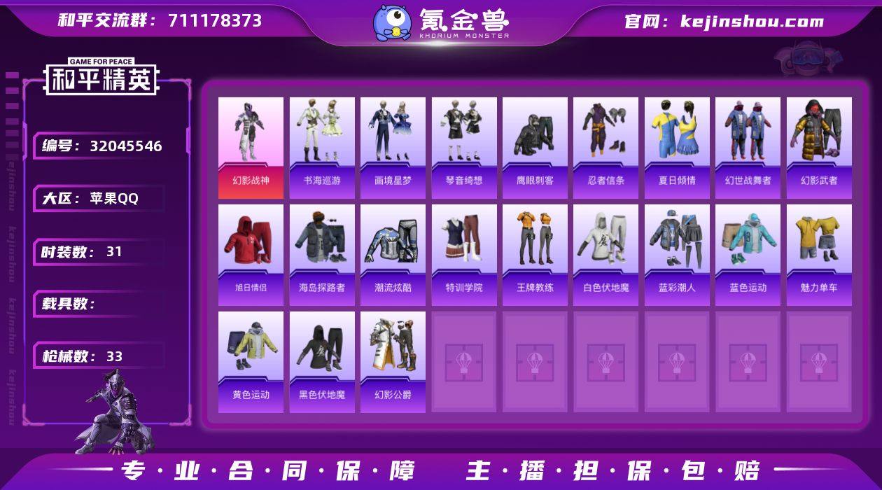 J2438 精品 1粉 1特 幻影战神 苹果 手Q-1粉装-1特效枪-0载具-0粉色飞行器-10035热力值-2王牌印记-31套装-33枪皮 【热门品类】:套装-忍者信条 【粉色套装】:粉装-幻影战神 【粉色枪皮等级】:Mk14-福马献瑞(五级) 【粉色枪皮】:Mk14-福马献瑞 【粉色降落伞】:绝对恒星降落伞,极限特训降落伞,幻影战神降落伞,极意拳锋降落伞 【稀有套装】:套装-雪国风尚,套装-马上有钱,套装-书海巡游,套装-画境星梦,套装-琴音绮想,套装-雨过天青,套装-红釉青花 【稀有枪皮】:AUG-幻影战神,AUG-绝对恒星,ACE32-画境星梦,UZI-幻影战神,汤姆逊-幻影战神,MP5K-画境星梦,Kar98K-幻影战神,AWM-雷霆特警,M1加兰德-画境星梦,S12K-幻影战神,AA12-G-画境星梦,突击盾牌-绝对恒星,平底锅-画境星梦 【其他套装】:套装-夏日倾情,套装-幻世战舞者,套装-幻影武者,套装-旭日情侣,套装-海岛探路者,套装-潮流炫酷,套装-特训学院,套装-王牌教练,套装-白色伏地魔,套装-蓝彩潮人,套装-蓝色运动,套装-魅力单车,套装-黄色运动,套装-黑色伏地魔,套装-鹰眼刺客,套装-幻影公爵 【稀有头盔】:甜心宝贝头盔(1级),幻影战神头盔(3级),幻影战神头盔(2级),幻影战神头盔(1级),深海小丑鱼头盔(1级) 【稀有背包】:幻影战神背包(3级),幻影战神背包(2级),幻影战神背包(1级) 【营地ID】:1030681227